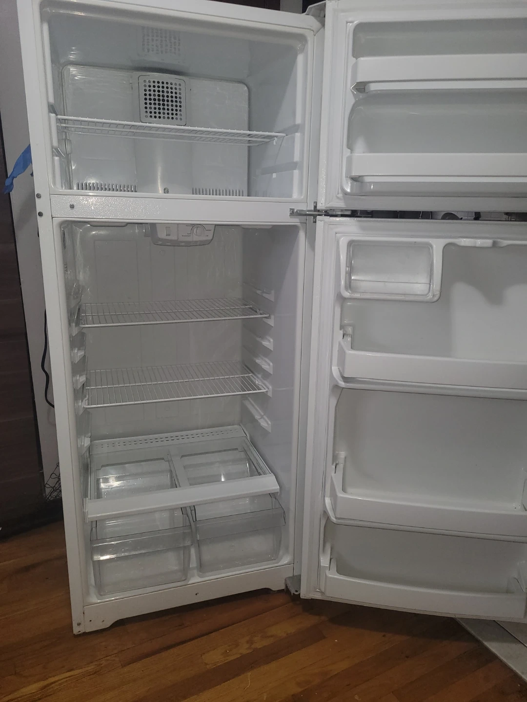 White Hotpoint refrigerator with freezer on top. It's got adjustable shelves in the fridge and door bins. Includes crisper drawers at the bottom.