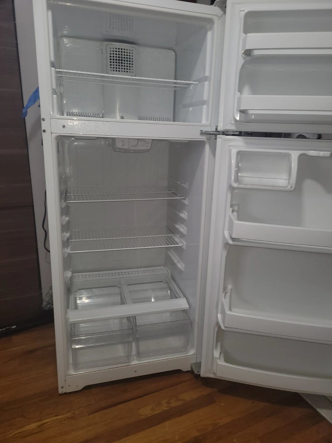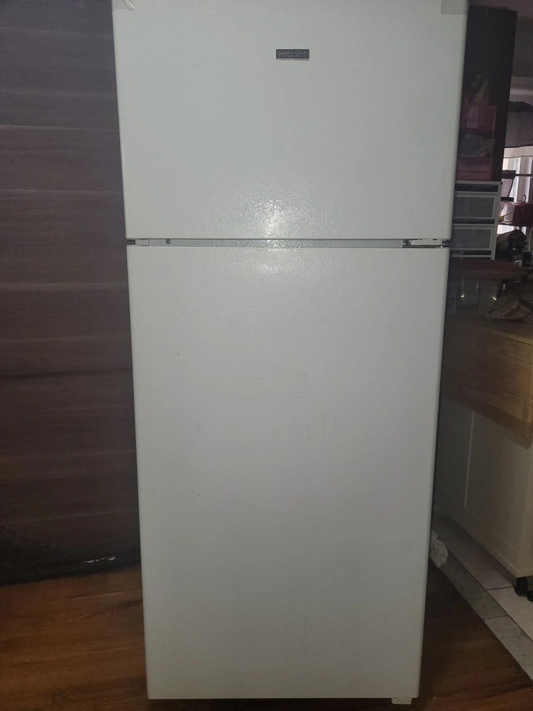 White Hotpoint refrigerator with freezer on top. It's got adjustable shelves in the fridge and door bins. Includes crisper drawers at the bottom.