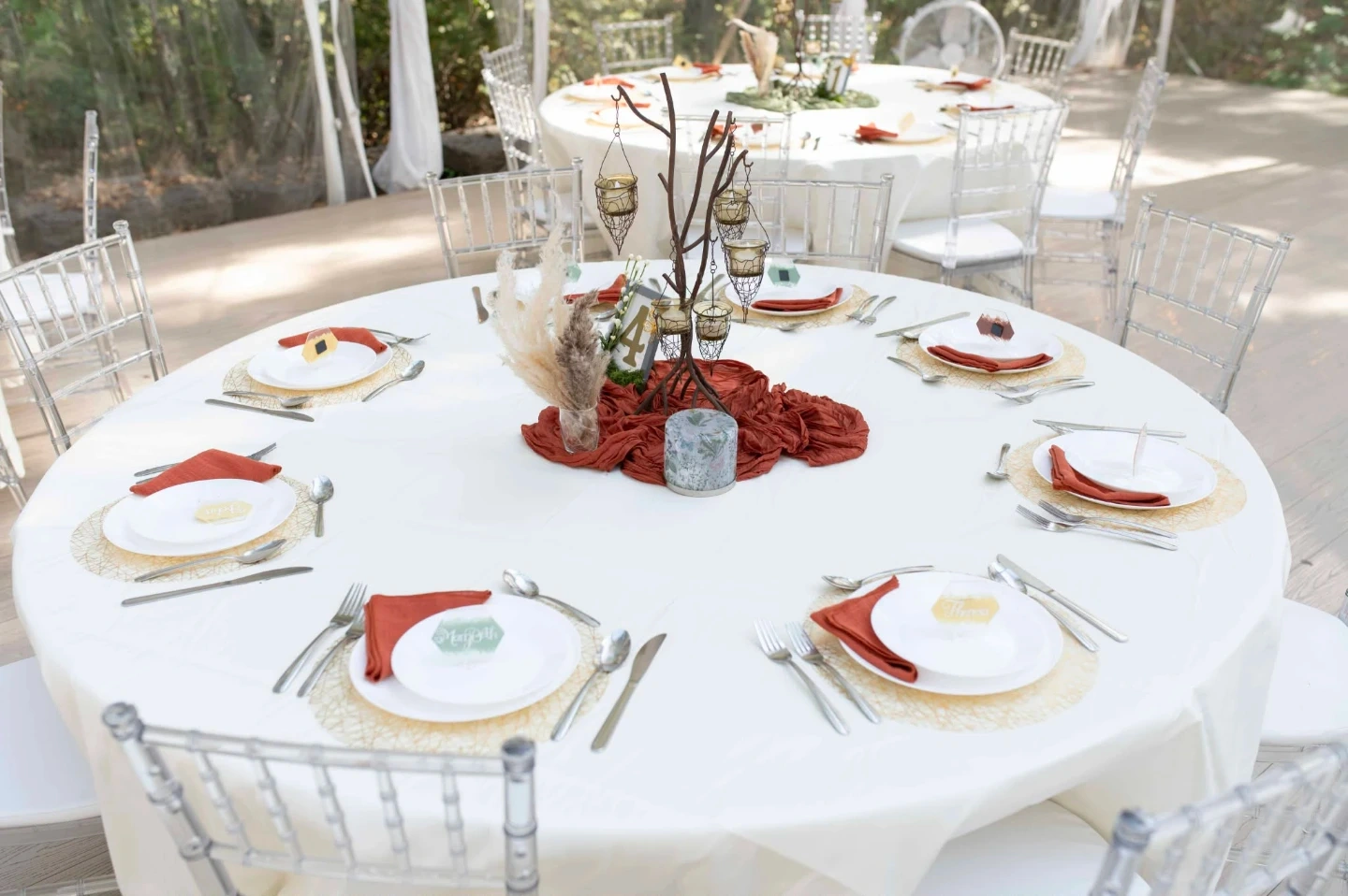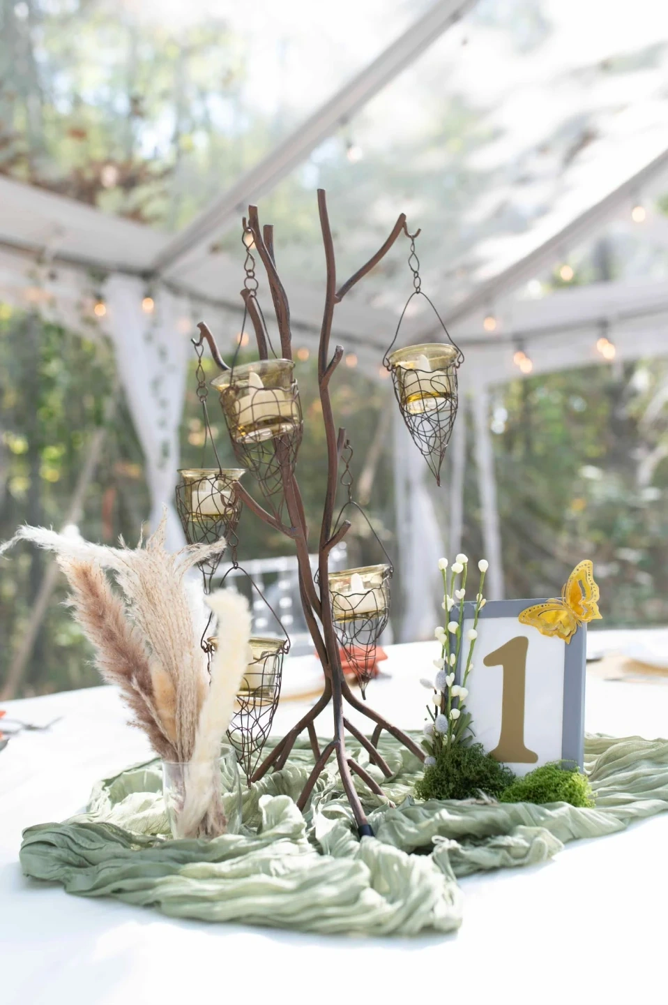This rustic candelabra centerpiece features a tree branch design with hanging glass candle holders. Each holder has a wire cage detail. It's perfect for adding a charming, natural touch to event decor.