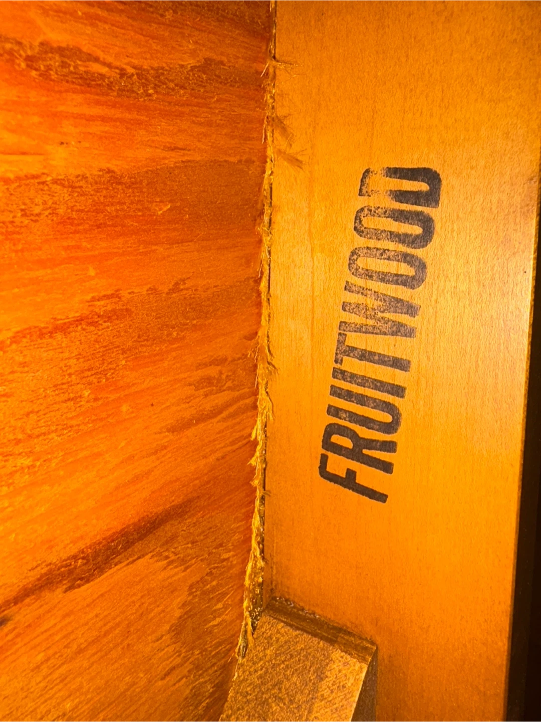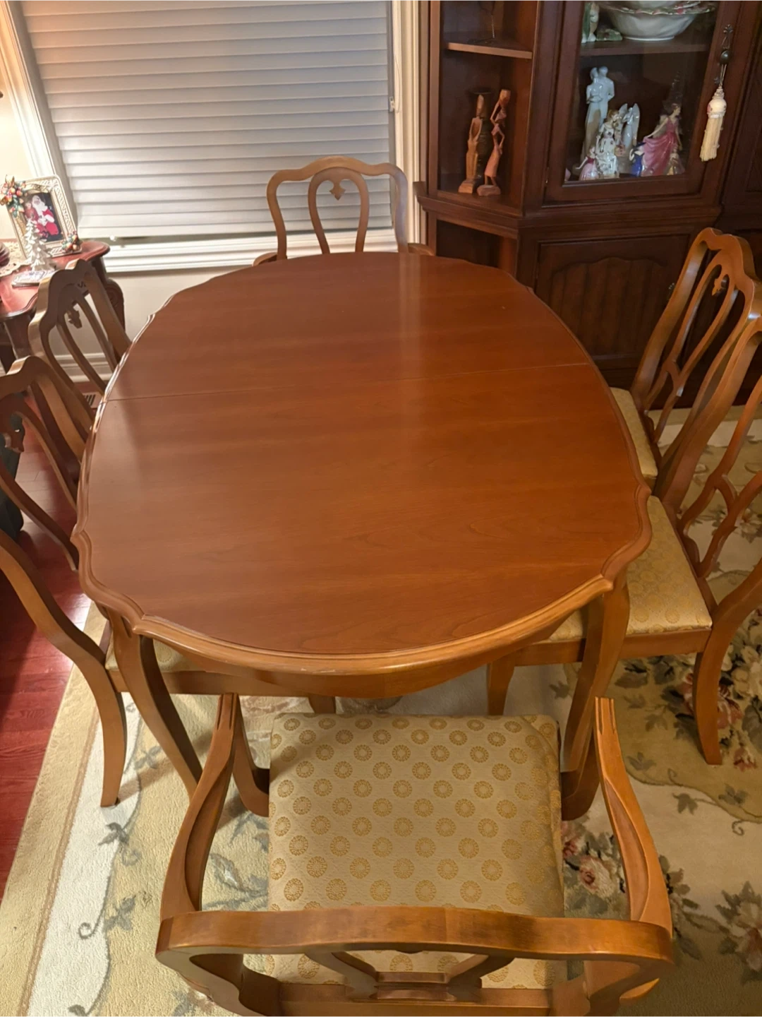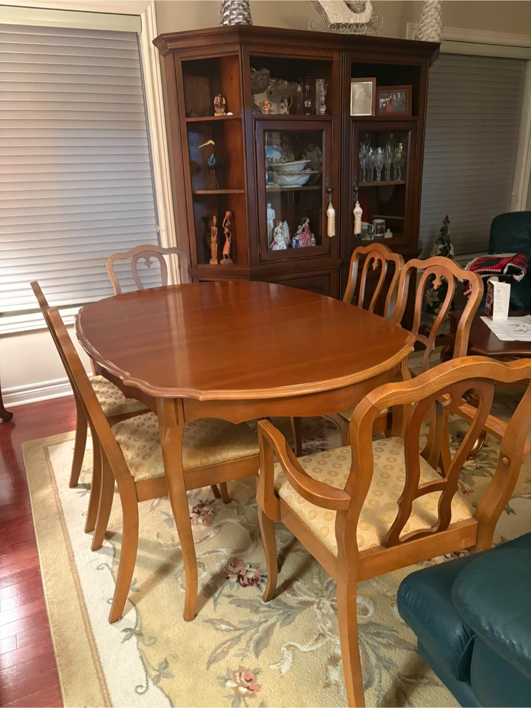 This dining set includes an oval-shaped wooden table with a fruitwood finish and six upholstered chairs. The chairs have a subtle gold patterned fabric and are made with synthetic foam. Made by Knechtel Furniture Ltd. in Ontario, Canada.