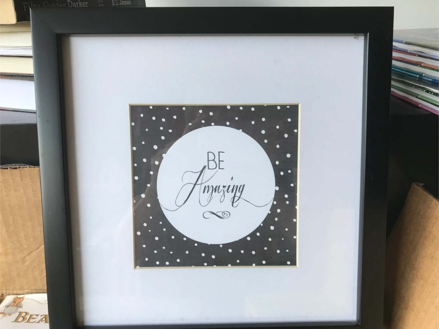 This framed wall art features the phrase "BE Amazing" in a stylish script. It has a black frame and a white matting around the central design. This piece is perfect for adding a touch of motivation to any room's decor. Great for a teenage girl’s room.