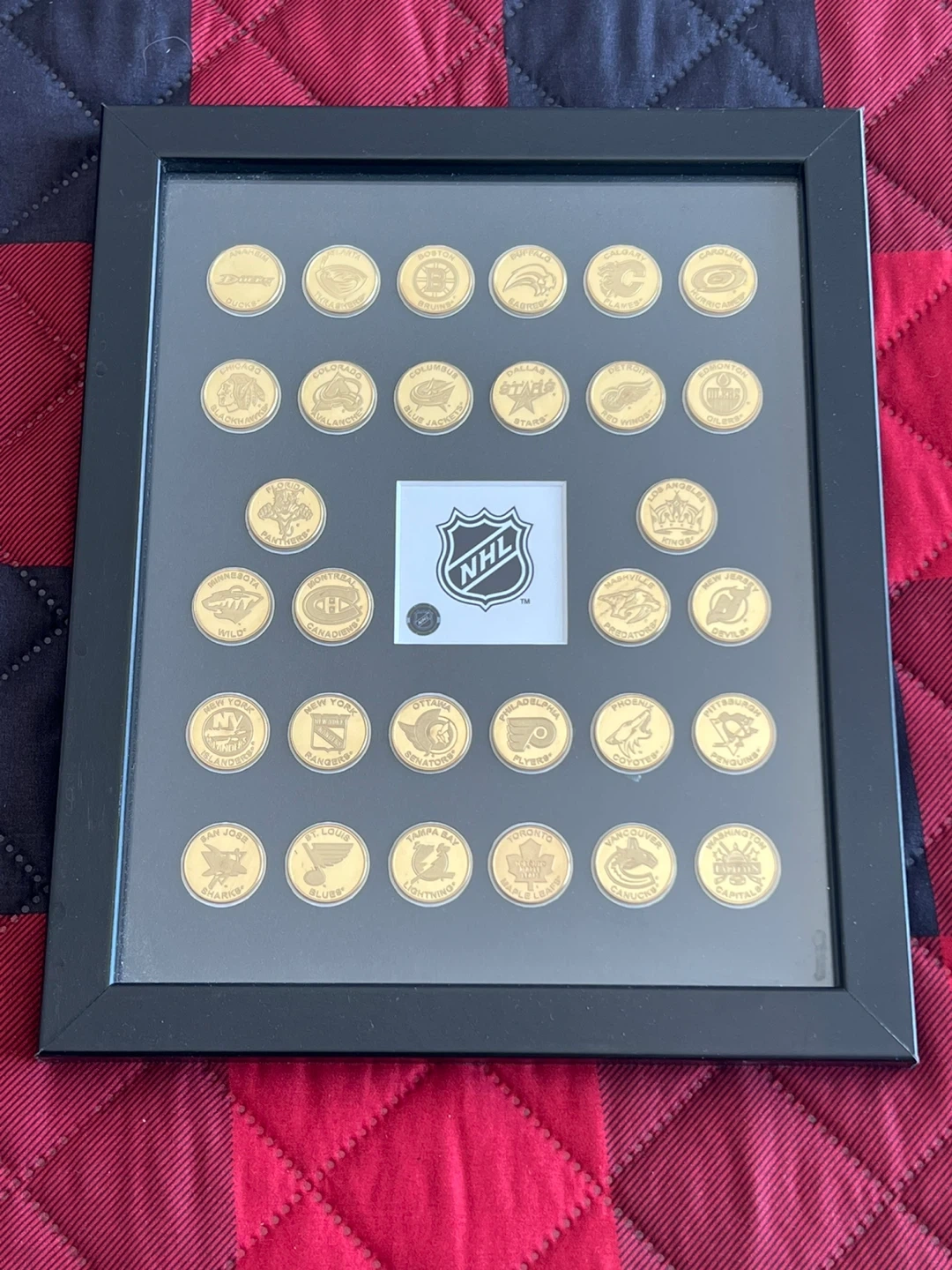 This framed display features 30 gold-tone discs, each showcasing a different NHL team logo. Includes a central NHL shield. It's a great piece for any hockey fan!