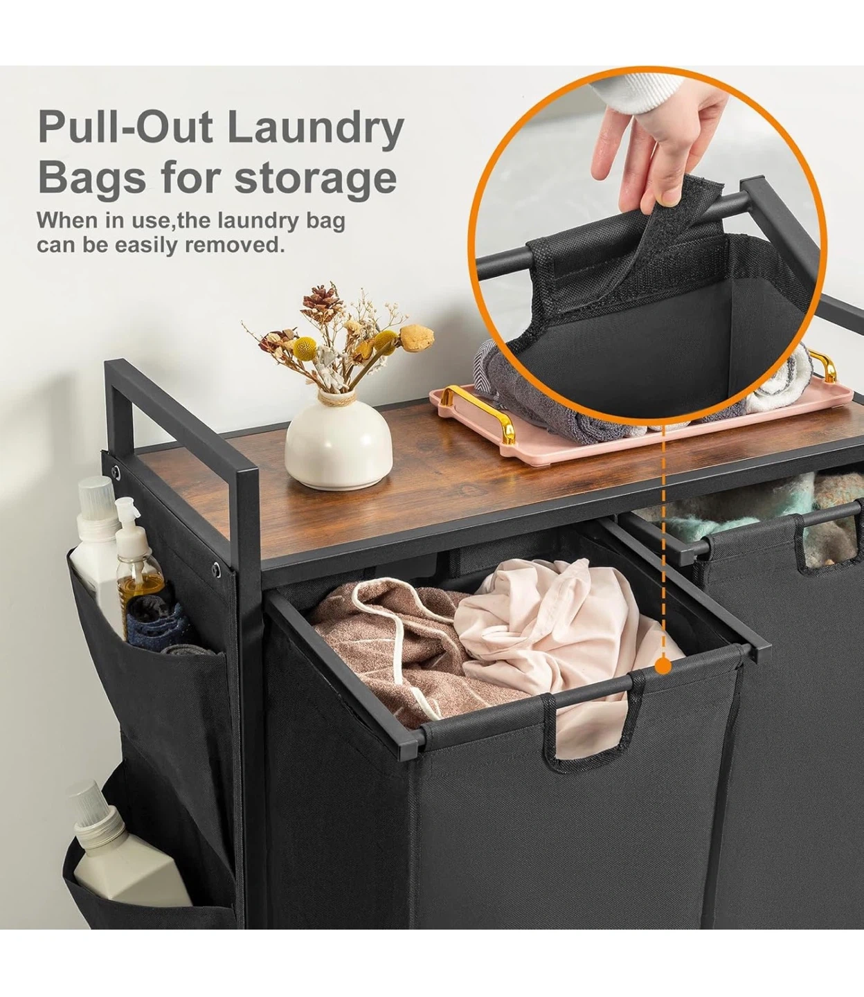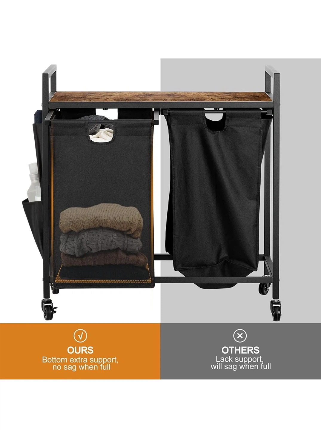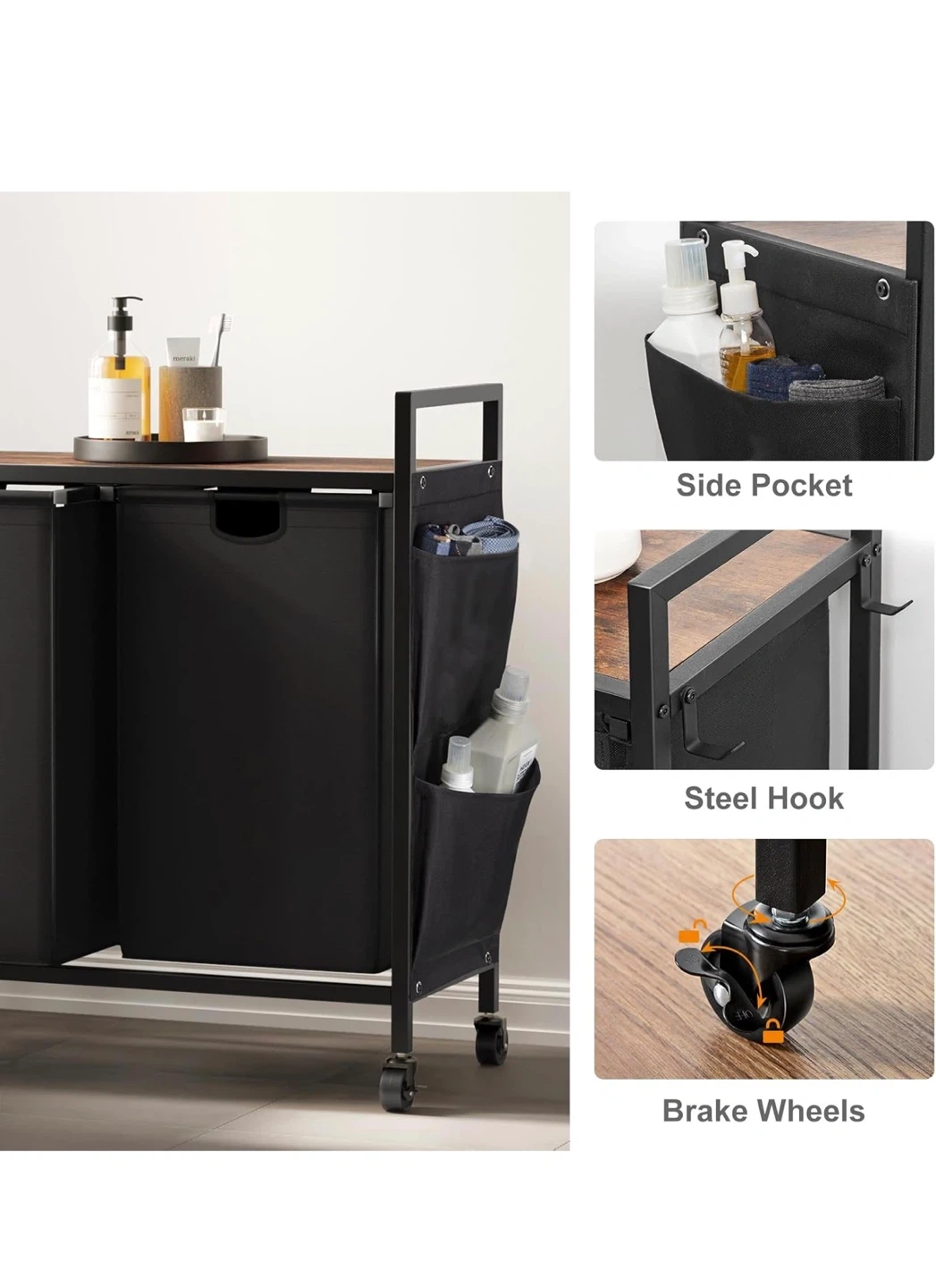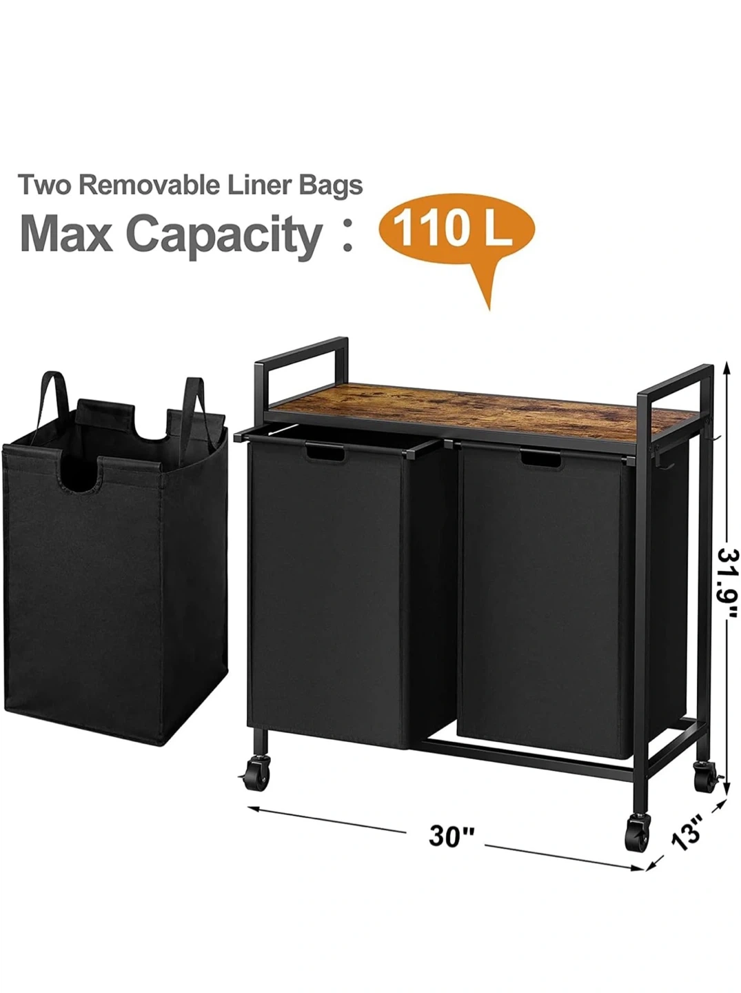 This double laundry hamper features two removable liner bags and a convenient top shelf. It's designed with wheels for easy mobility and offers a max capacity of 110 L. The frame is iron-made, and the bags are black fabric.