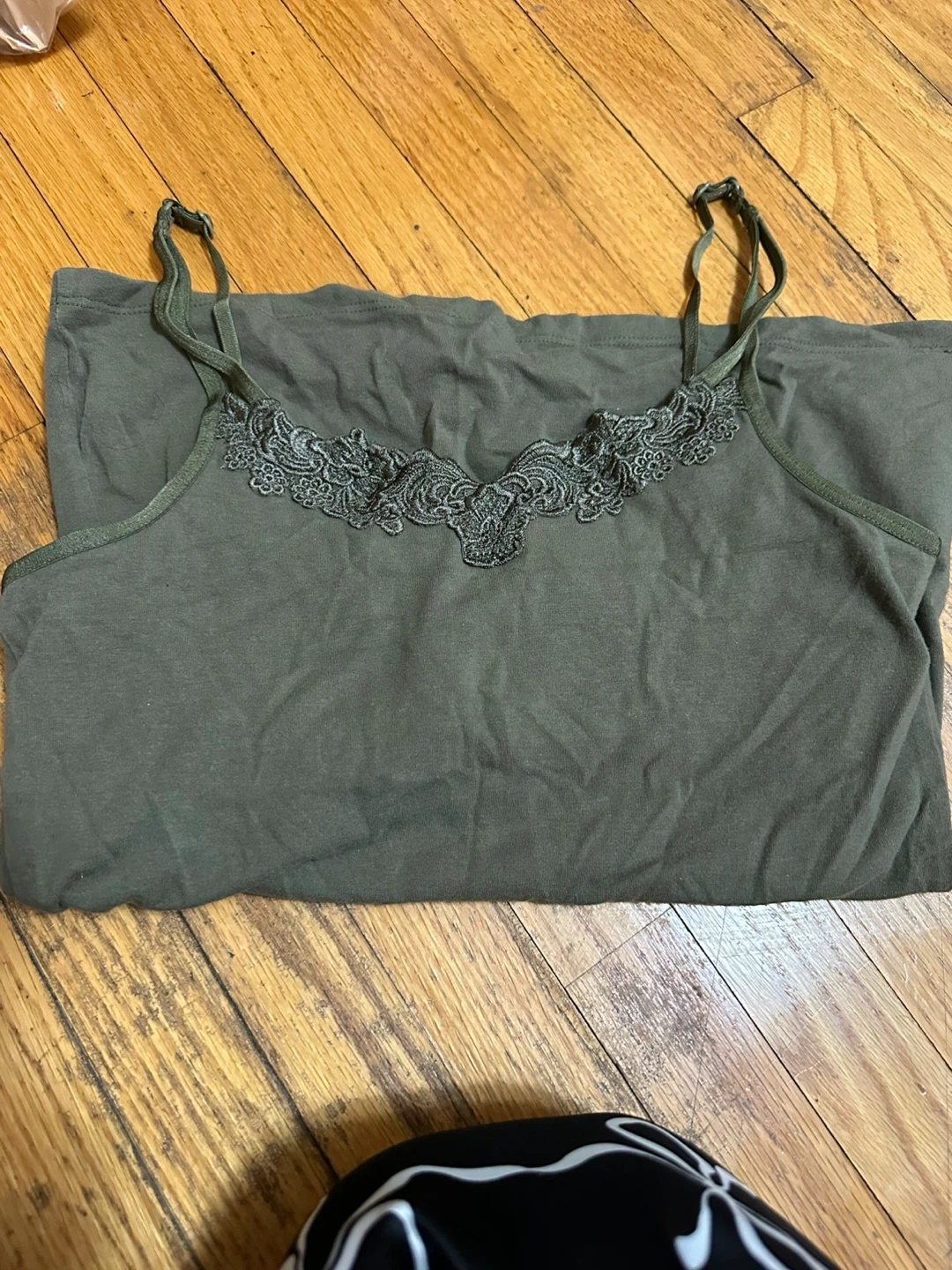 A comfy olive green camisole. Features delicate lace detailing around the neckline and adjustable spaghetti straps. It's made from a soft, breathable fabric.