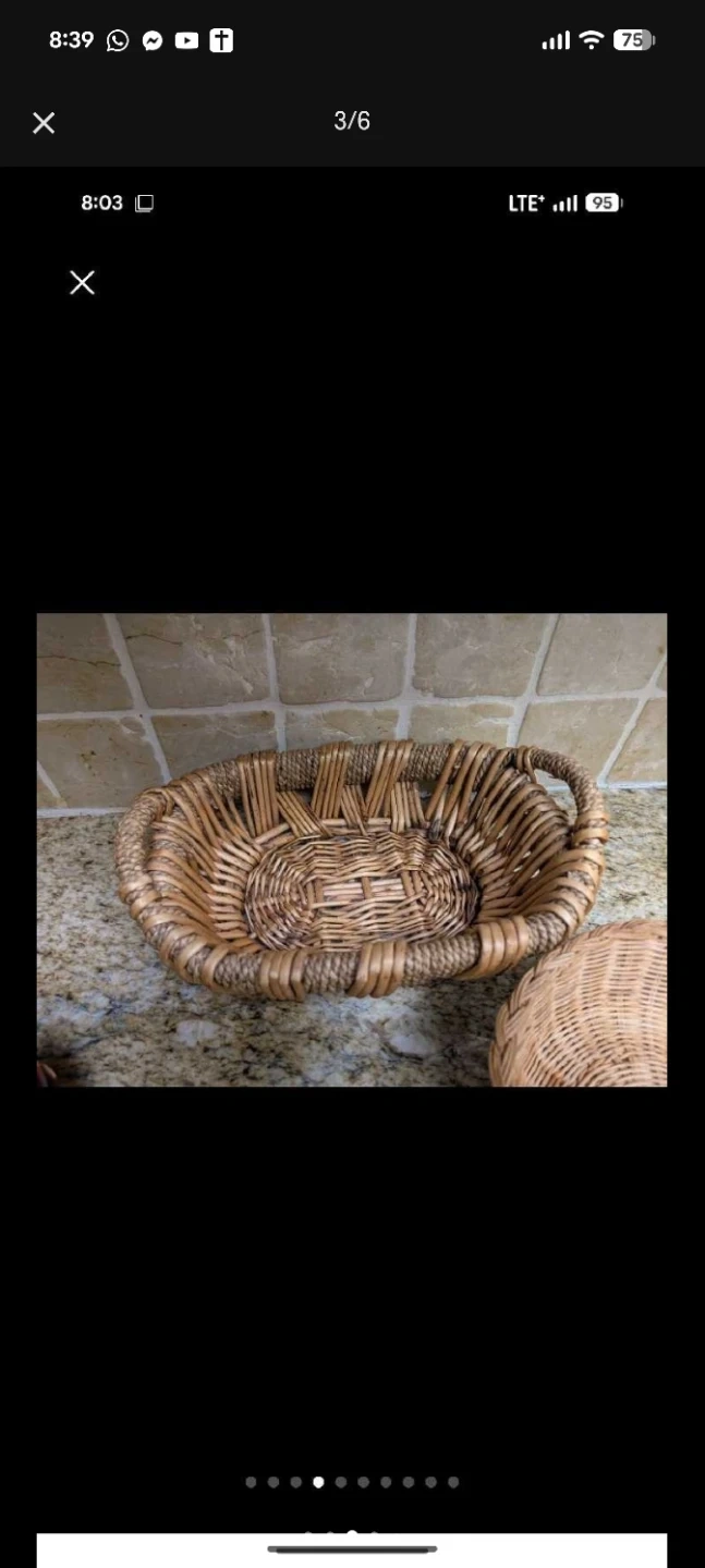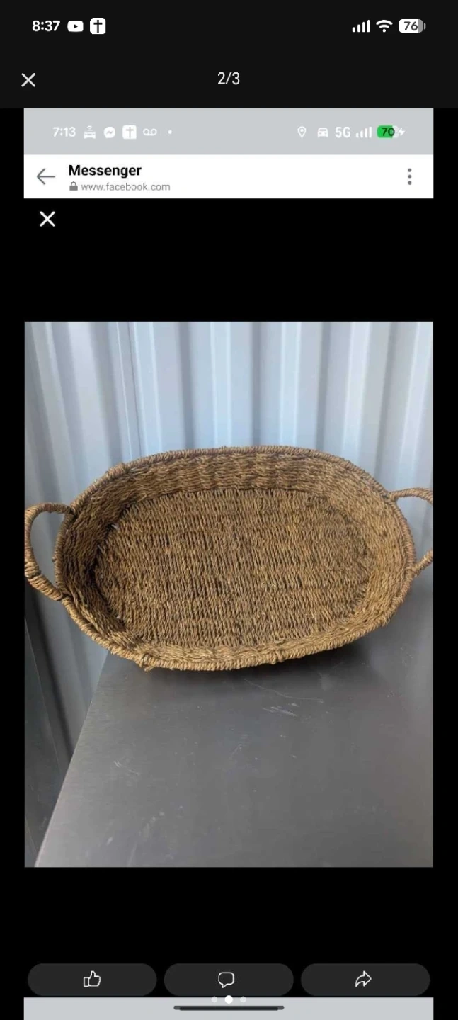A collection of five assorted wicker baskets for storage or decor. Includes a unique owl-shaped one and a round woven tray. They're all made from natural woven materials.