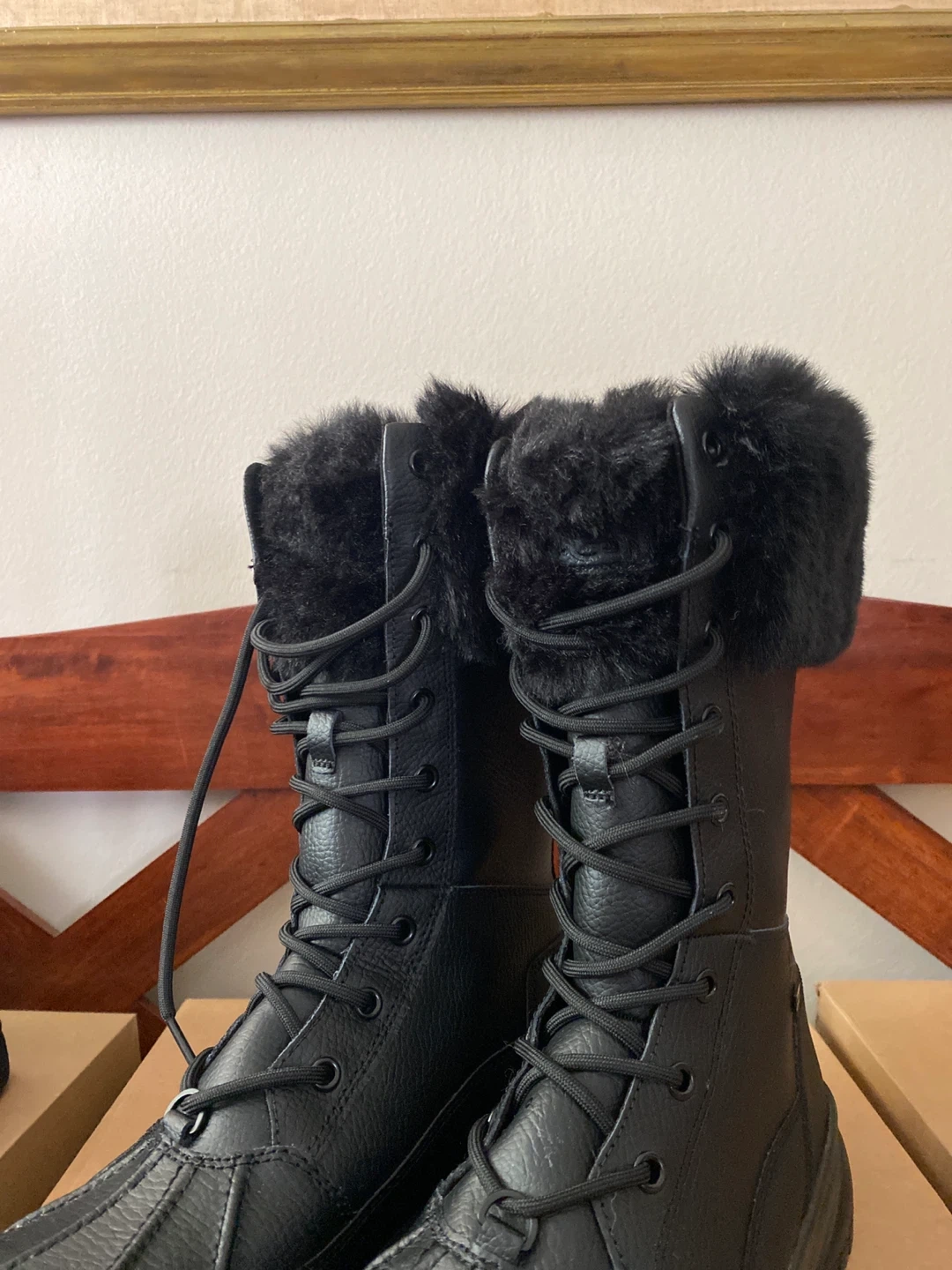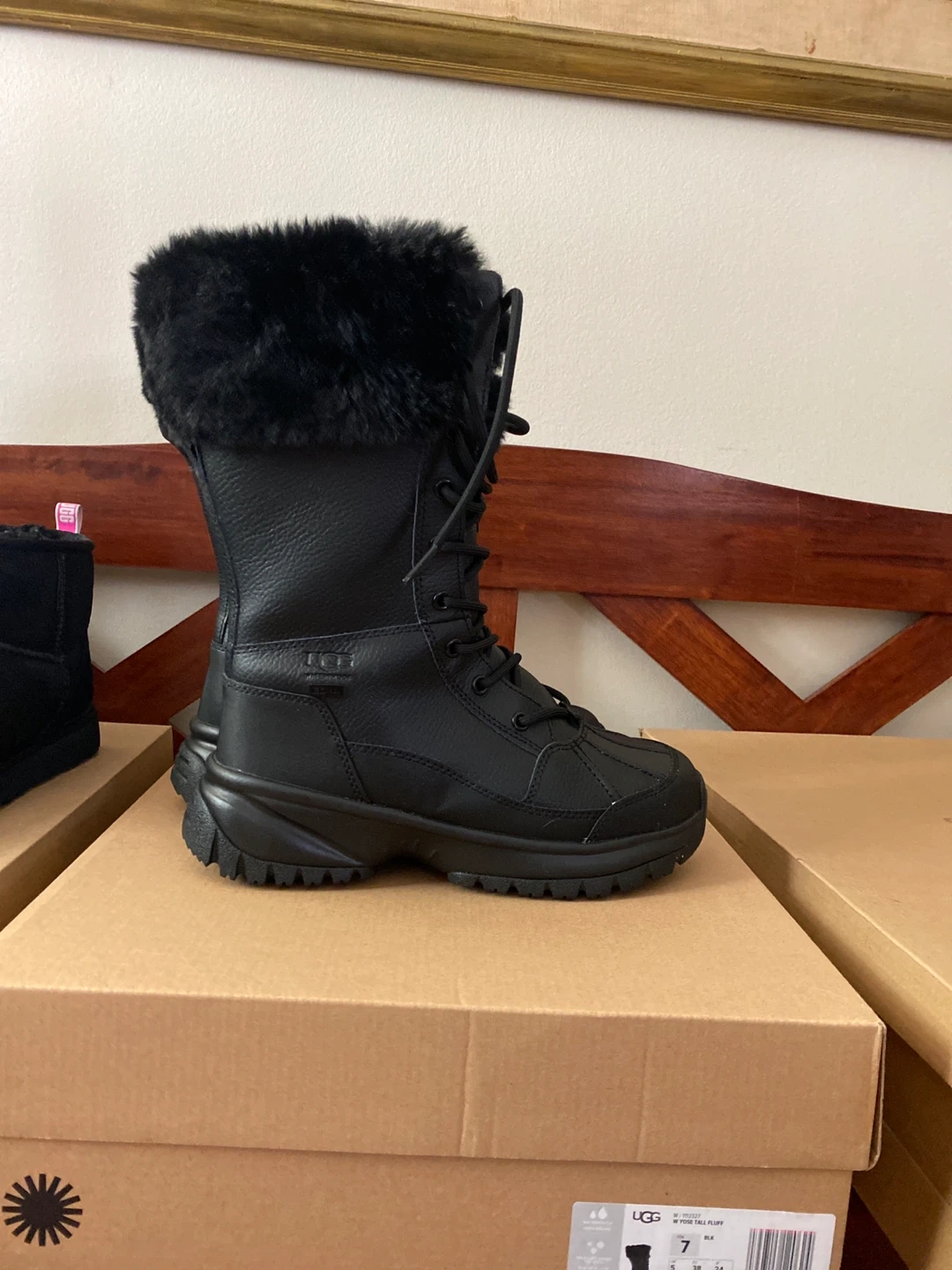 Selling a pair of UGG W Yose Tall Fluff boots in size 7. They are black and new . The boots come with the original box.