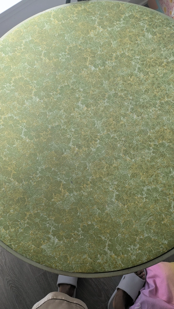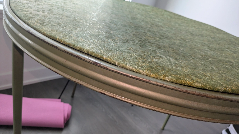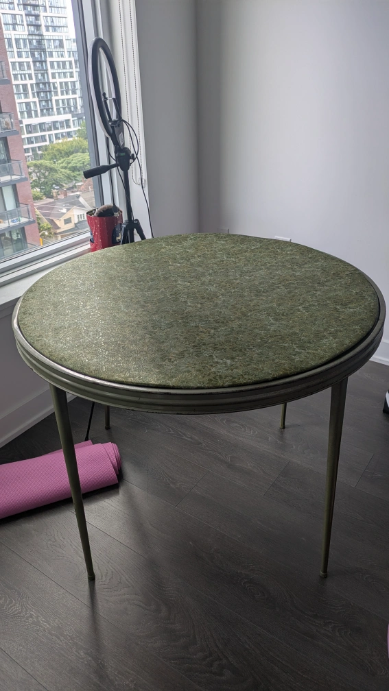 Selling a vintage round table with a green patterned top. It has a unique retro look and would be a great addition to any home. The table shows some signs of wear, as seen in the photos, but is still sturdy and functional. Could be used either as a dining table or patio table to entertain guests!