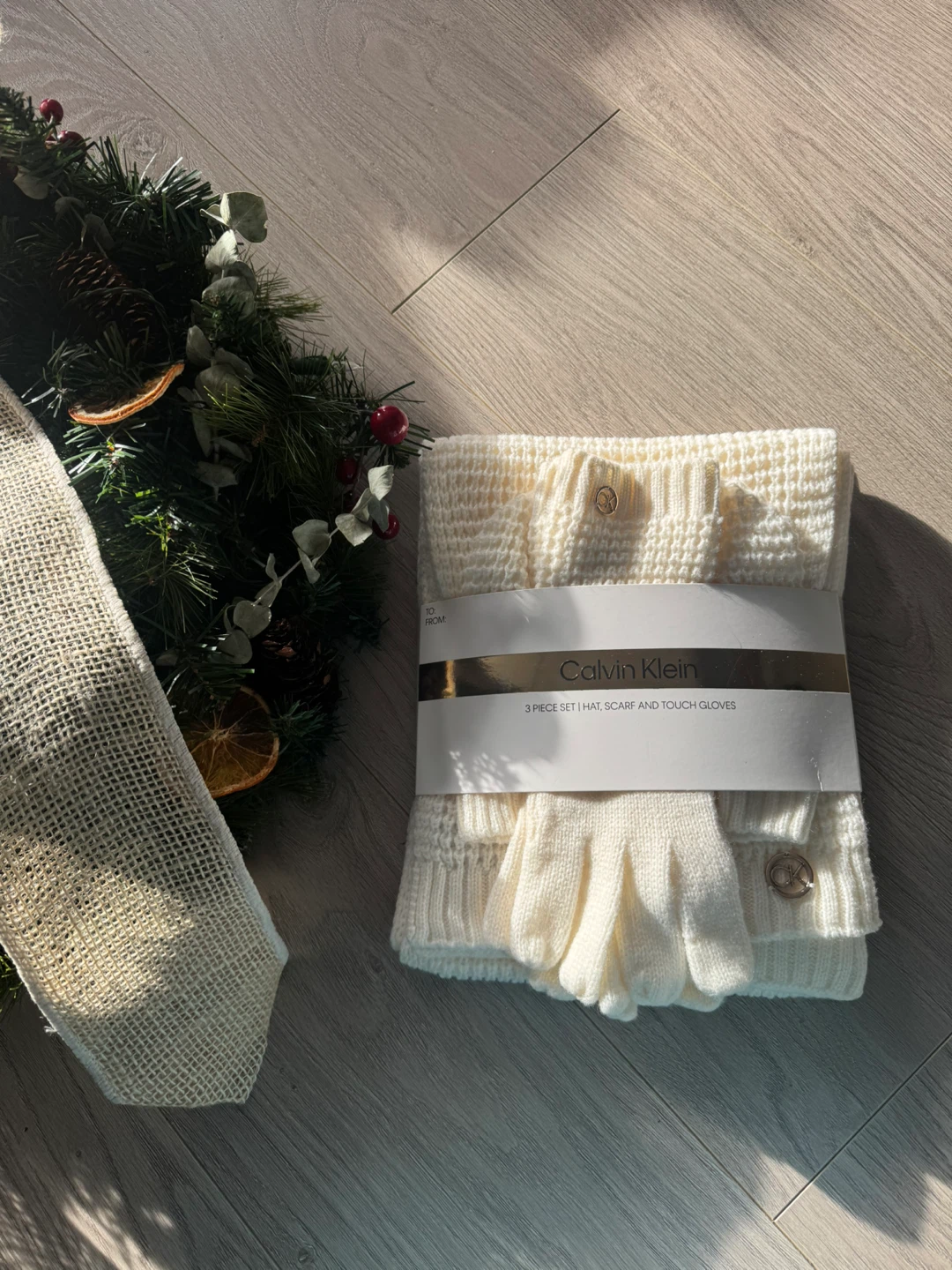 Selling a brand new Calvin Klein 3-piece set including a hat, scarf, and touch gloves! The set is a beautiful cream colour and would make a lovely gift for someone as Christmas present.