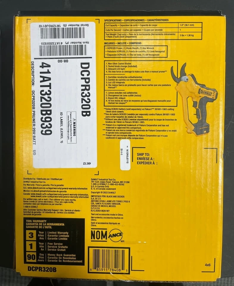 Brand new in box. Model: DCPR320B. Seller price: $130. Pickup at Islington and Rexdale, Etobicoke. Cash only. This 20V MAX Cordless Hand Pruner is great for any yard. It has non-stick coated blades for smooth cutting, preventing sap buildup, and rust resistance. The pruner has a 1.5-inch cut capacity for larger branches and a tooled blade change for user serviceability. An integrated LED light helps illuminate branches for precision cutting.