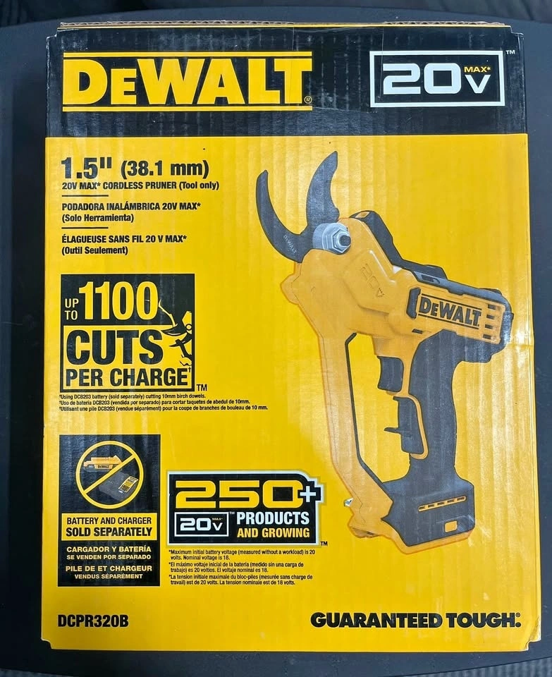 Brand new in box. Model: DCPR320B. Seller price: $130. Pickup at Islington and Rexdale, Etobicoke. Cash only. This 20V MAX Cordless Hand Pruner is great for any yard. It has non-stick coated blades for smooth cutting, preventing sap buildup, and rust resistance. The pruner has a 1.5-inch cut capacity for larger branches and a tooled blade change for user serviceability. An integrated LED light helps illuminate branches for precision cutting.