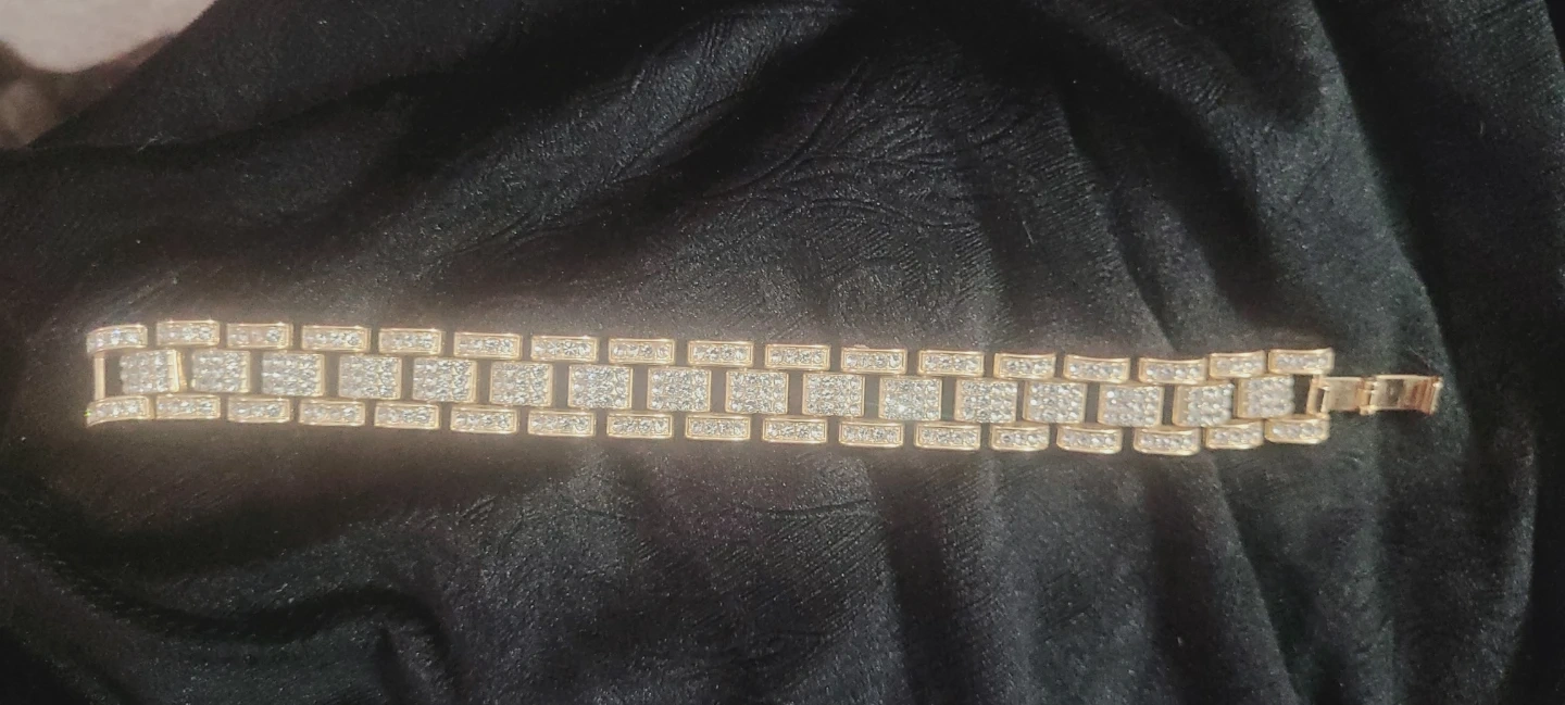 This gold tone link bracelet features clear rhinestones across its surface. It fastens with a secure clasp. A nice accessory for adding some sparkle to an outfit!