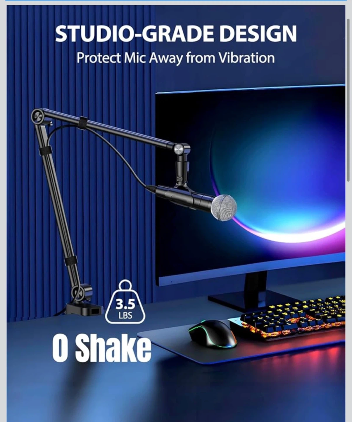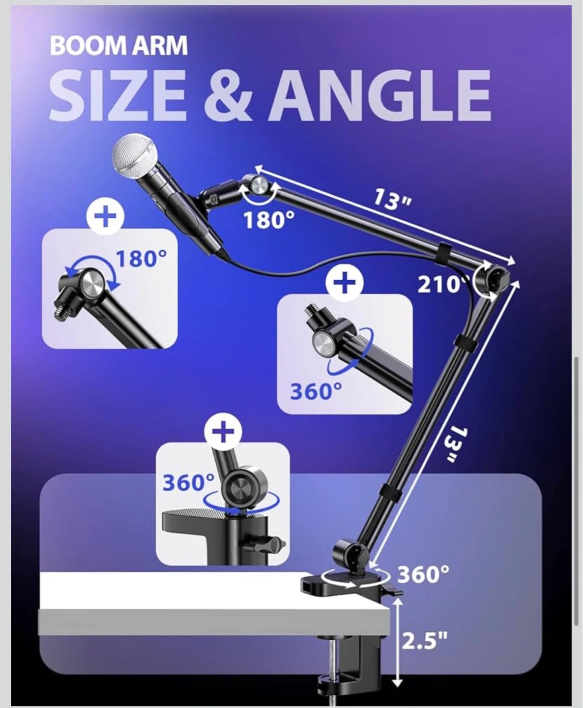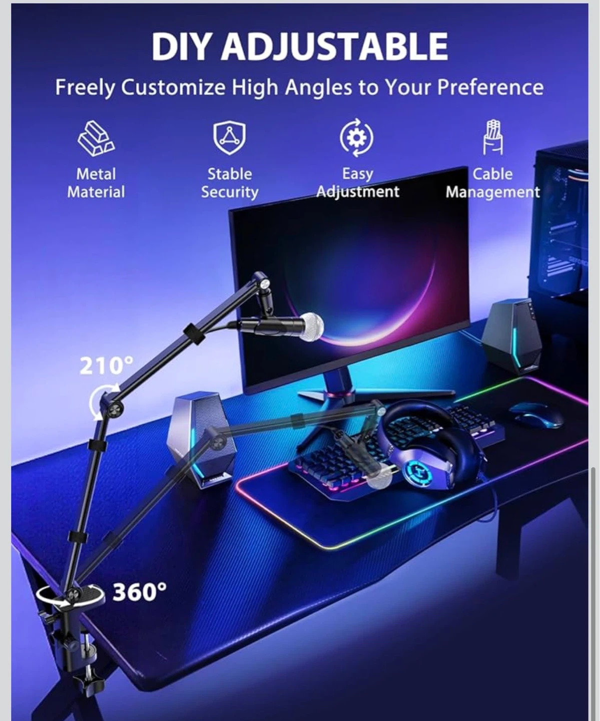Microphone Boom Arm, Aluminum Alloy Mic Arm Stand for Blue Yeti, HyperX QuadCast, Shure SM7B and Other Mic, 360° Rotatable Head Mic Arm Desk Mount with 3/8" to 5/8" Adapter for Podcast Gaming