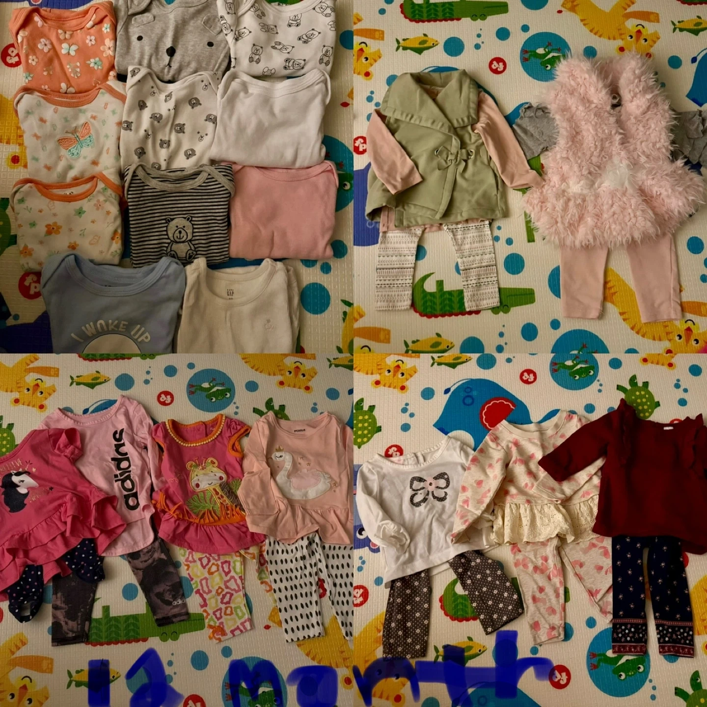 Size 12 months, gently used - look at both posted pictures, like new. A mixed bundle of baby girls' clothing in various styles. Includes onesies, pants, tops, a dress, and a jacket. Many pieces are soft cotton, perfect for everyday wear. Some items feature cute patterns and playful graphics!