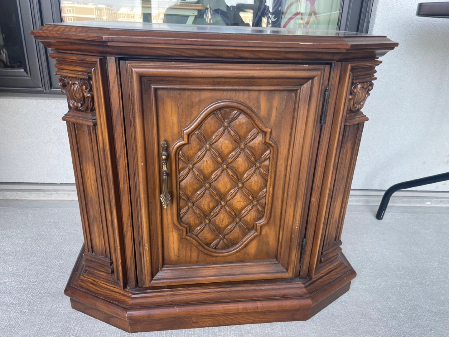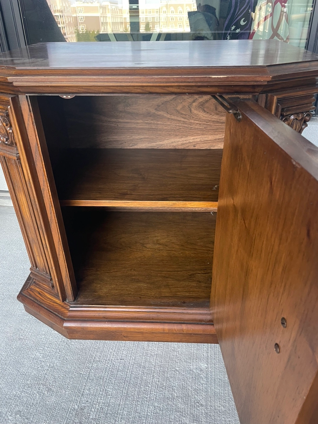Octagonal shaped wooden tables.Features a single door cabinet with a shelf. Intricate carvings and a dark wood finish. Great as a side table or end table.