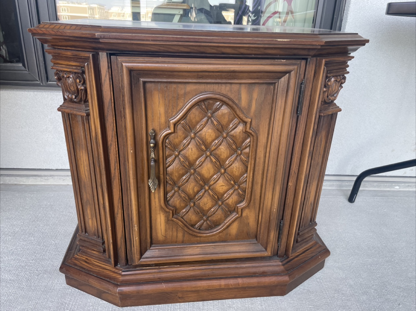 Octagonal shaped wooden tables.Features a single door cabinet with a shelf. Intricate carvings and a dark wood finish. Great as a side table or end table.