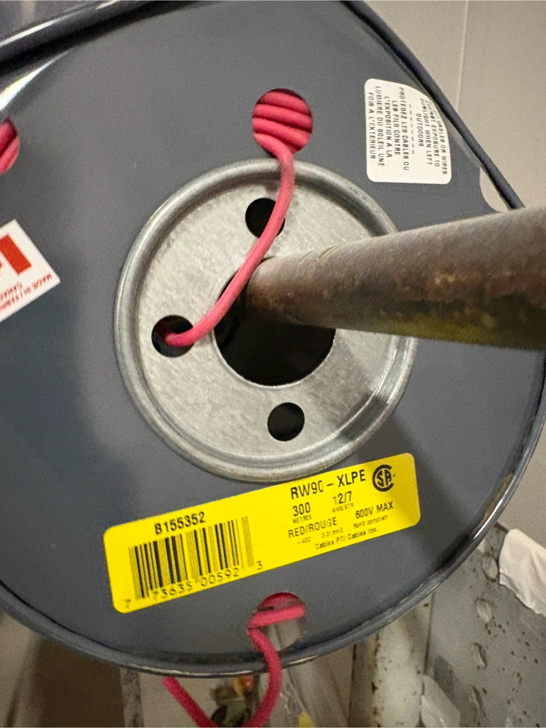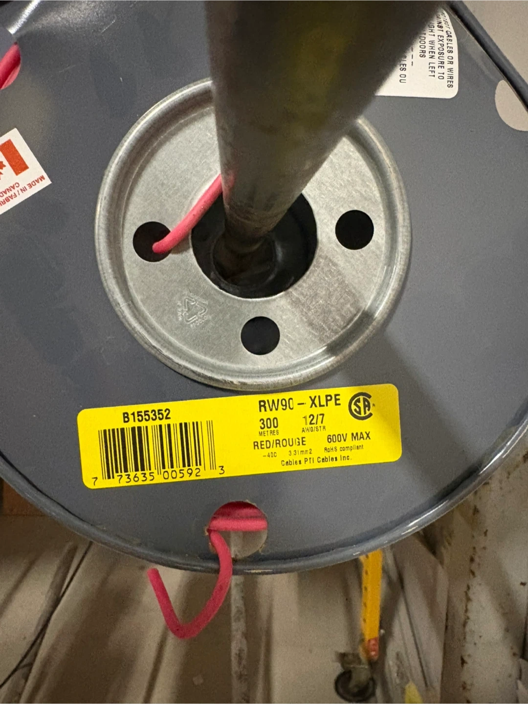 This is a spool of RW90 XLPE cable, 300 metres in length. It's red and rated for 600V maximum. Manufactured by Cables PDI Cables Inc. A roll of wire like this is useful for electrical installations.