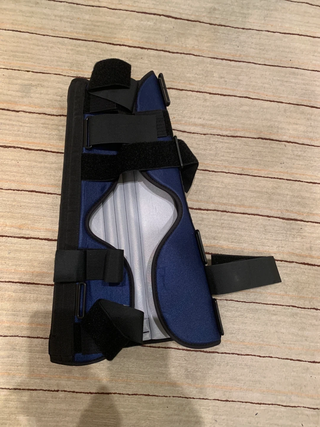 This wrist brace is made of durable blue fabric and features adjustable straps for a secure fit. It provides support and comfort for the wrist. Material is fabric with internal plastic support.