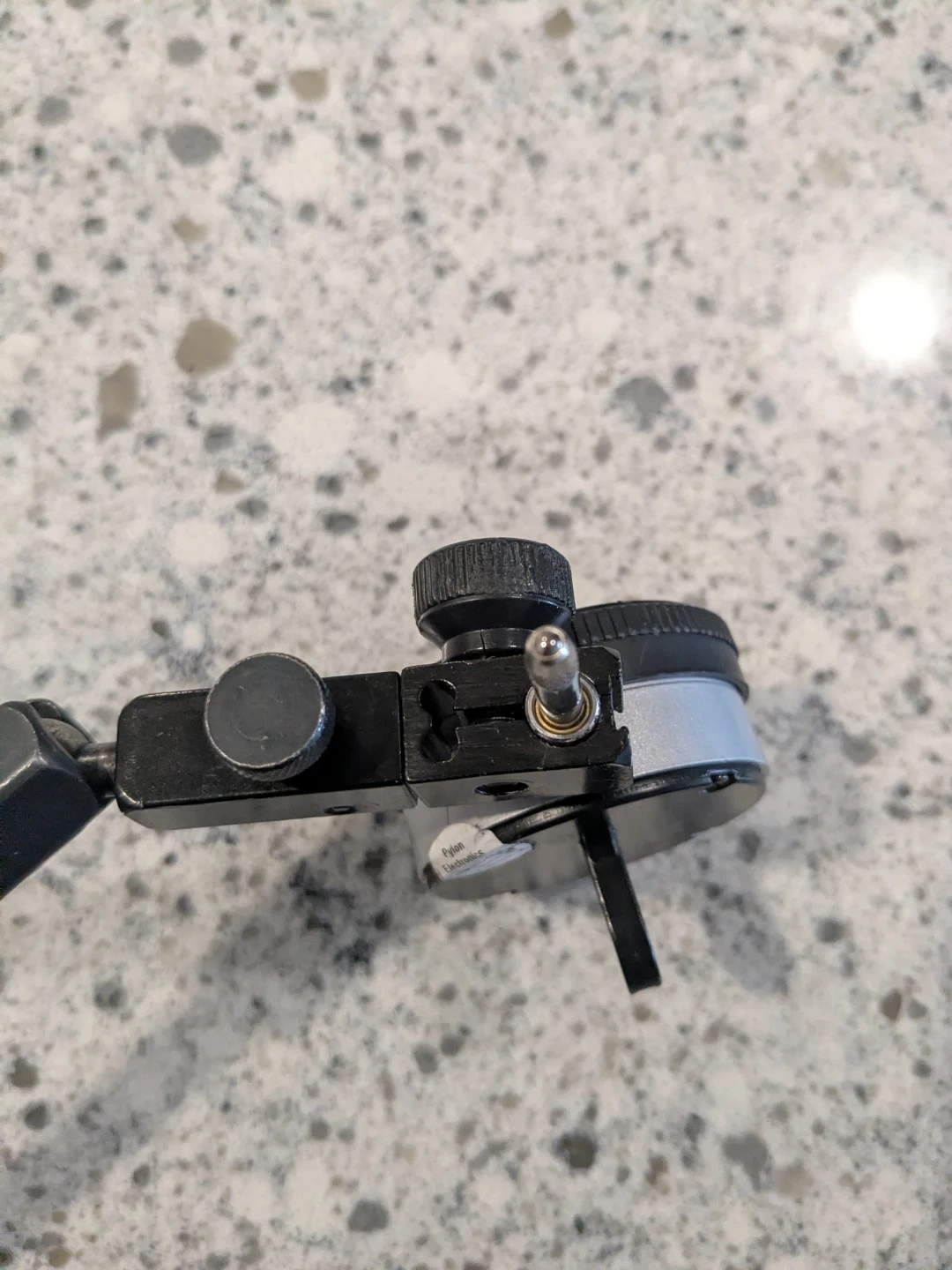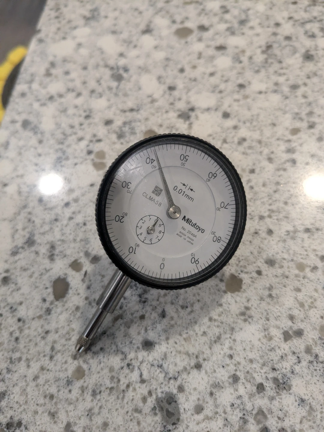 Mitutoyo dial indicator with a magnetic base stand (not Mitutoyo). The indicator measures in 0.01mm increments. An adjusting nut has to be replaced, working both.