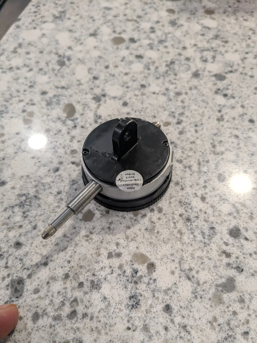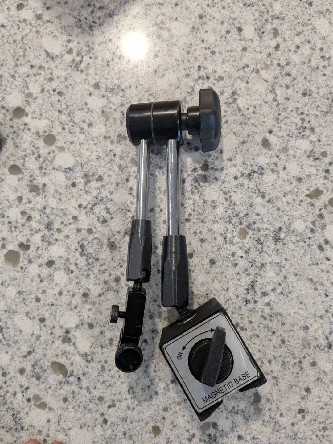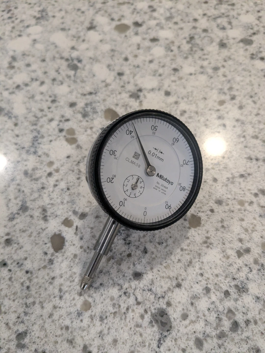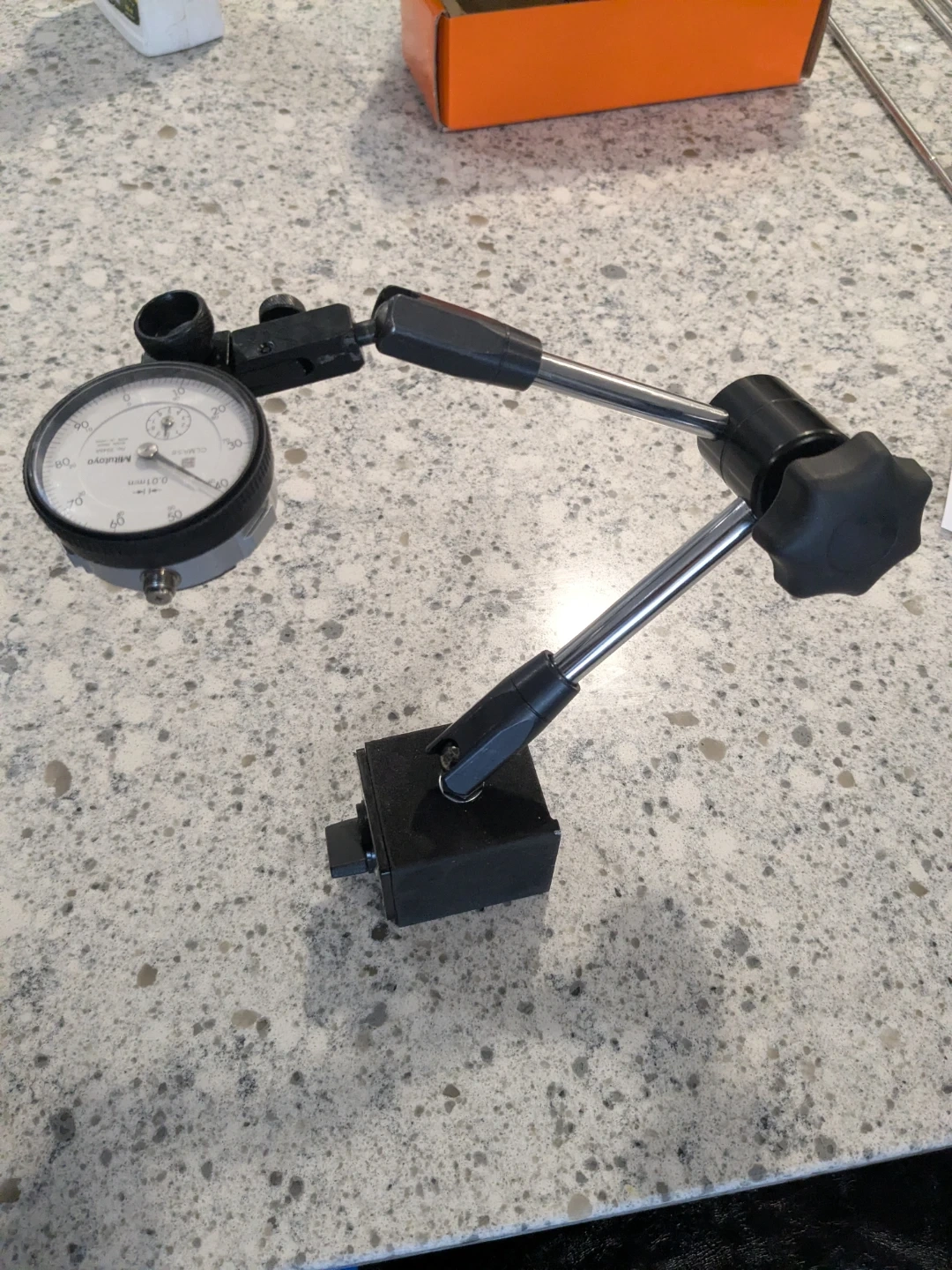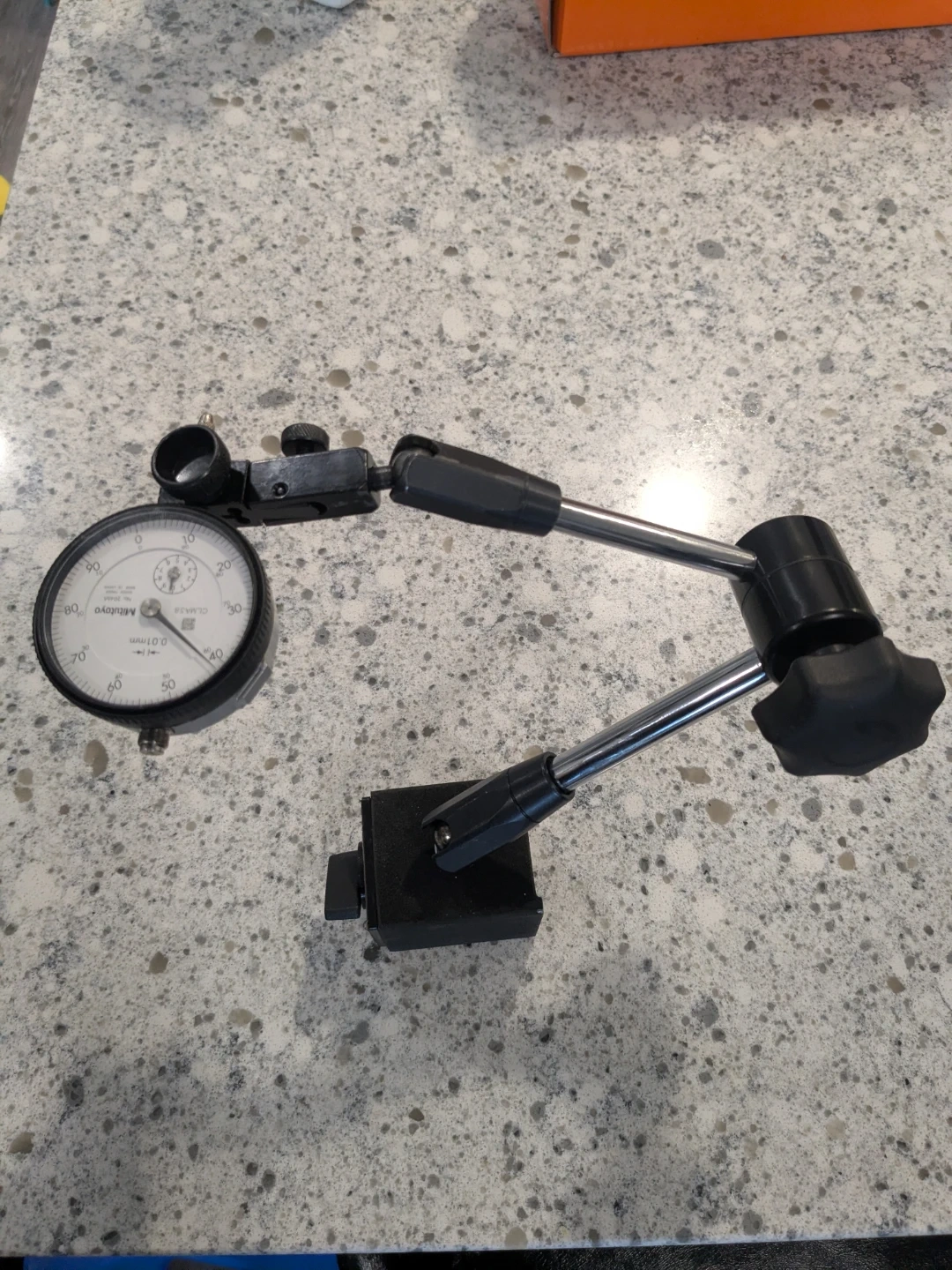 Mitutoyo dial indicator with a magnetic base stand (not Mitutoyo). The indicator measures in 0.01mm increments. An adjusting nut has to be replaced, working both.