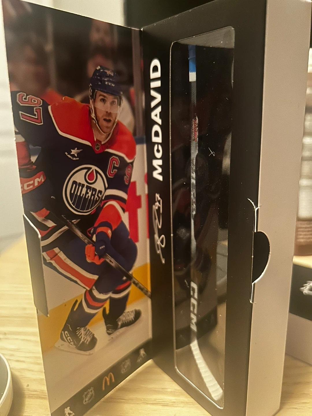 This is a replica hockey stick featuring Connor McDavid. It's presented in a display box with his image. The stick is branded CCM.
