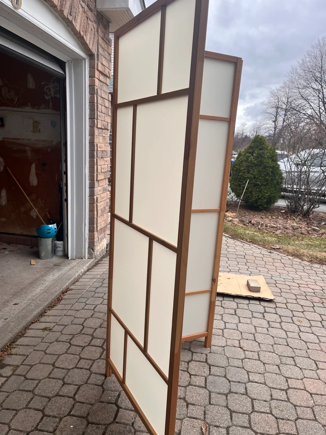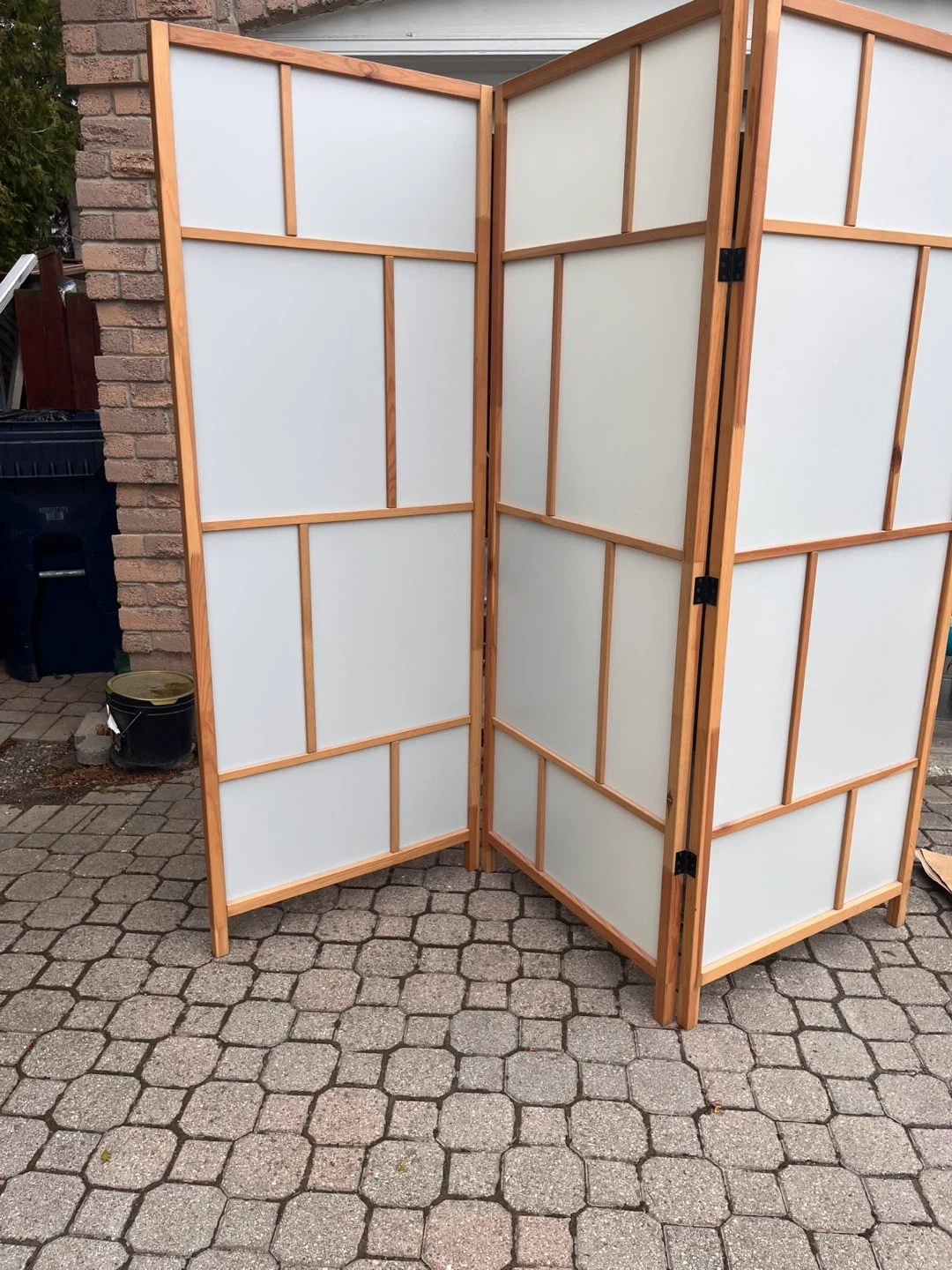 Wooden room divider with a modern geometric pattern on cream-coloured panels. It's a 3-panel folding screen, perfect for dividing space or adding a decorative element. Panels connect with hinges for easy adjustment. Measures approximately 180 cm tall.