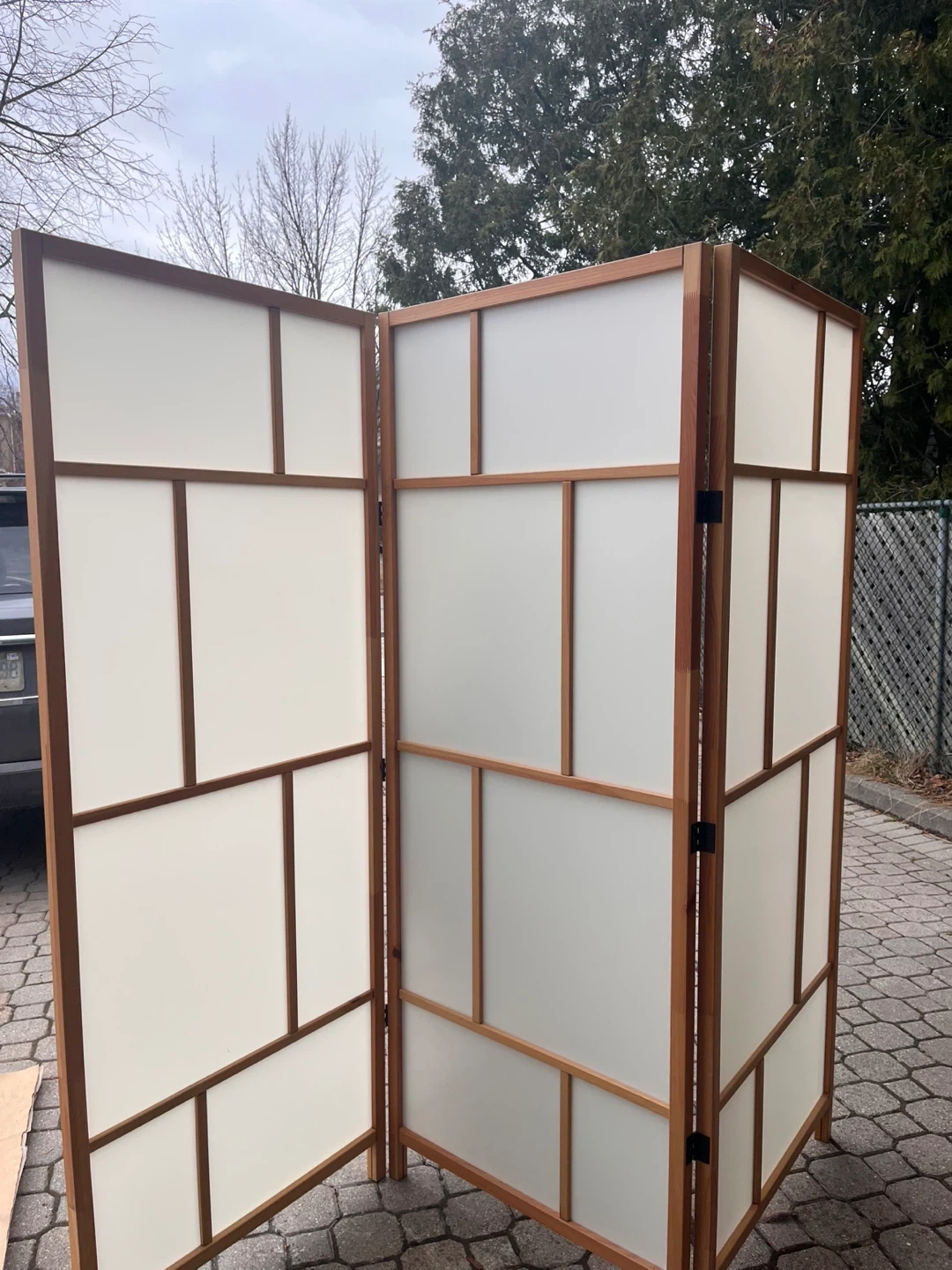 Wooden room divider with a modern geometric pattern on cream-coloured panels. It's a 3-panel folding screen, perfect for dividing space or adding a decorative element. Panels connect with hinges for easy adjustment. Measures approximately 180 cm tall.