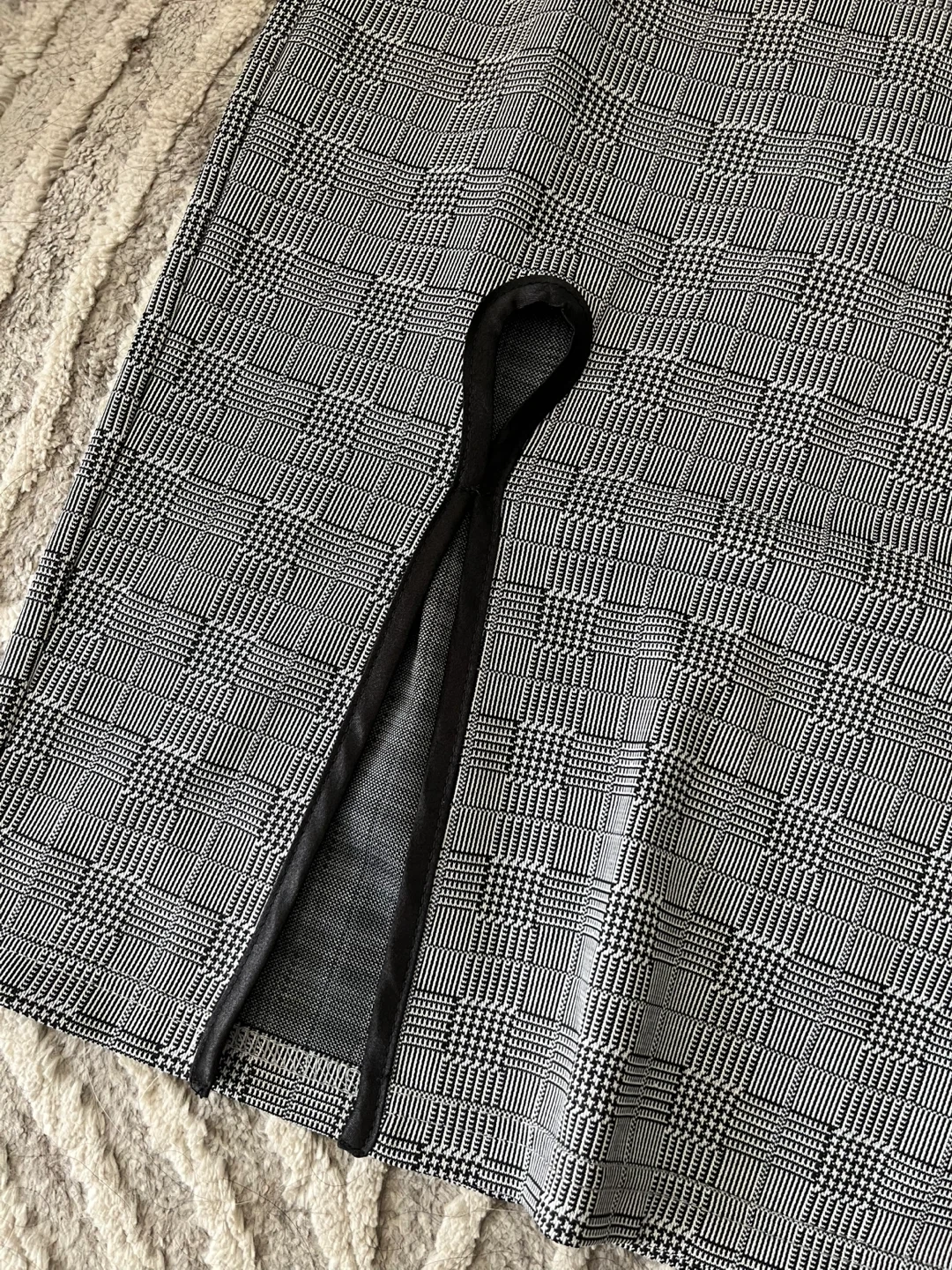 A stylish plaid pencil skirt featuring a black and white houndstooth pattern. It has two decorative black trim slits on the front. This skirt is a versatile addition to your wardrobe!