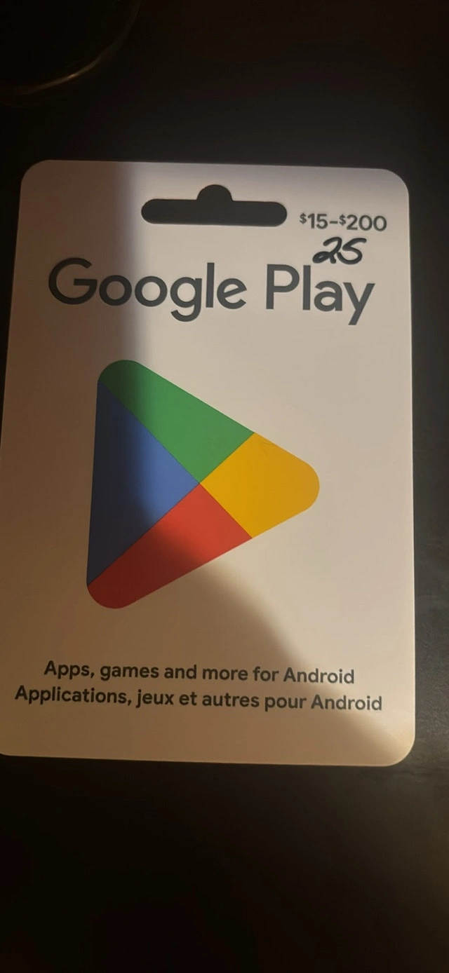 Selling this Google Play card as I don't have Android. It doesn't have a receipt and I'm not handing out any details of the card whatsoever. You can come pick it up and redeem it here if you think it's a scam, thanks!