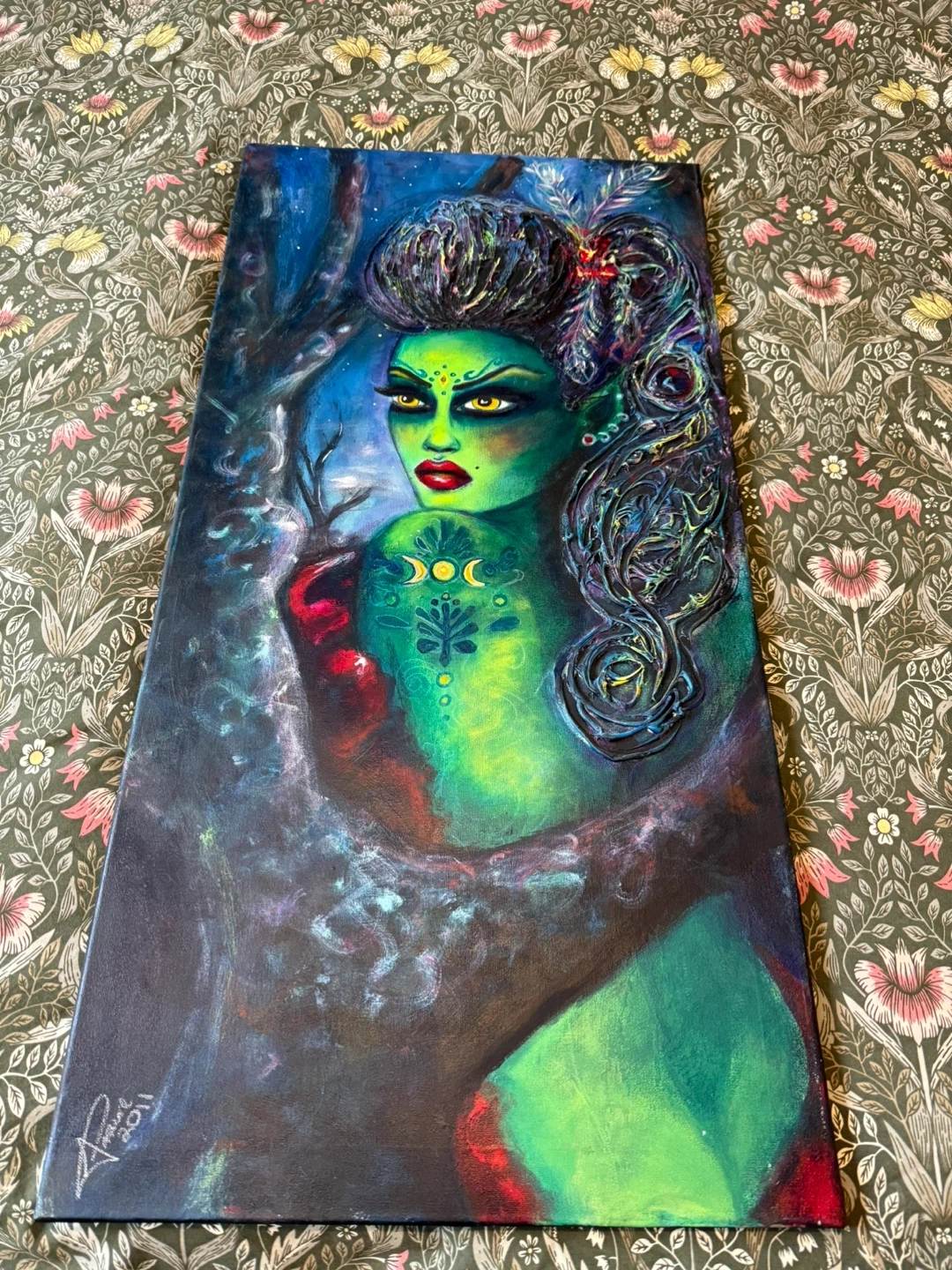 Unique, hand-painted canvas depicting a mystical green woman figure surrounded by dark foliage. The artwork features vibrant colours and detailed textures, signed by the artist in 2011. It's perfect for adding a touch of enchantment to your space! Paid $400