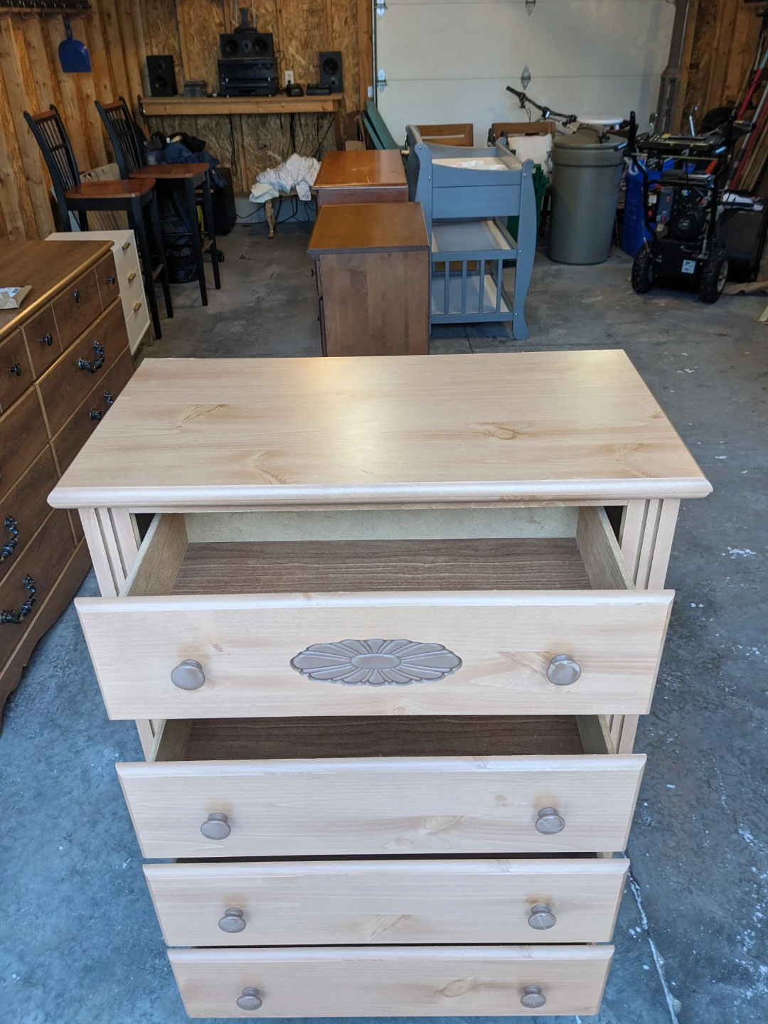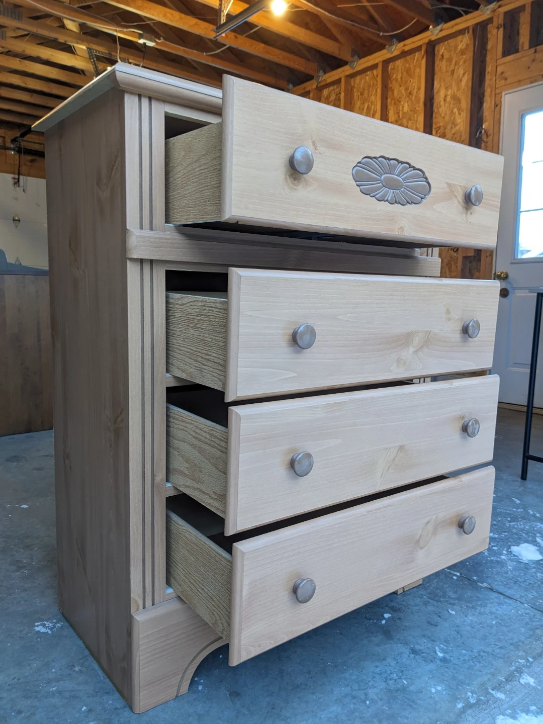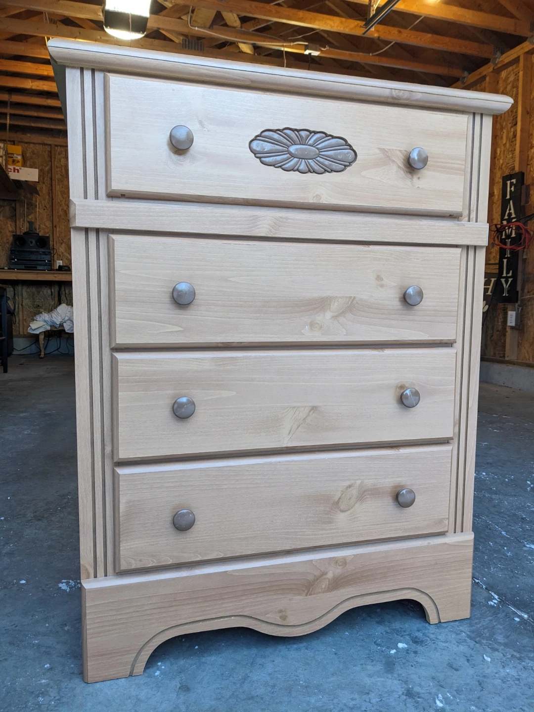 Drawers that all open and close perfectly and their modern slides with security stop system. Perfect interiors. Wood carved floral motif and scalloped edge base gives this piece a traditional charm. Curbside delivery is available with delivery payment in advance.