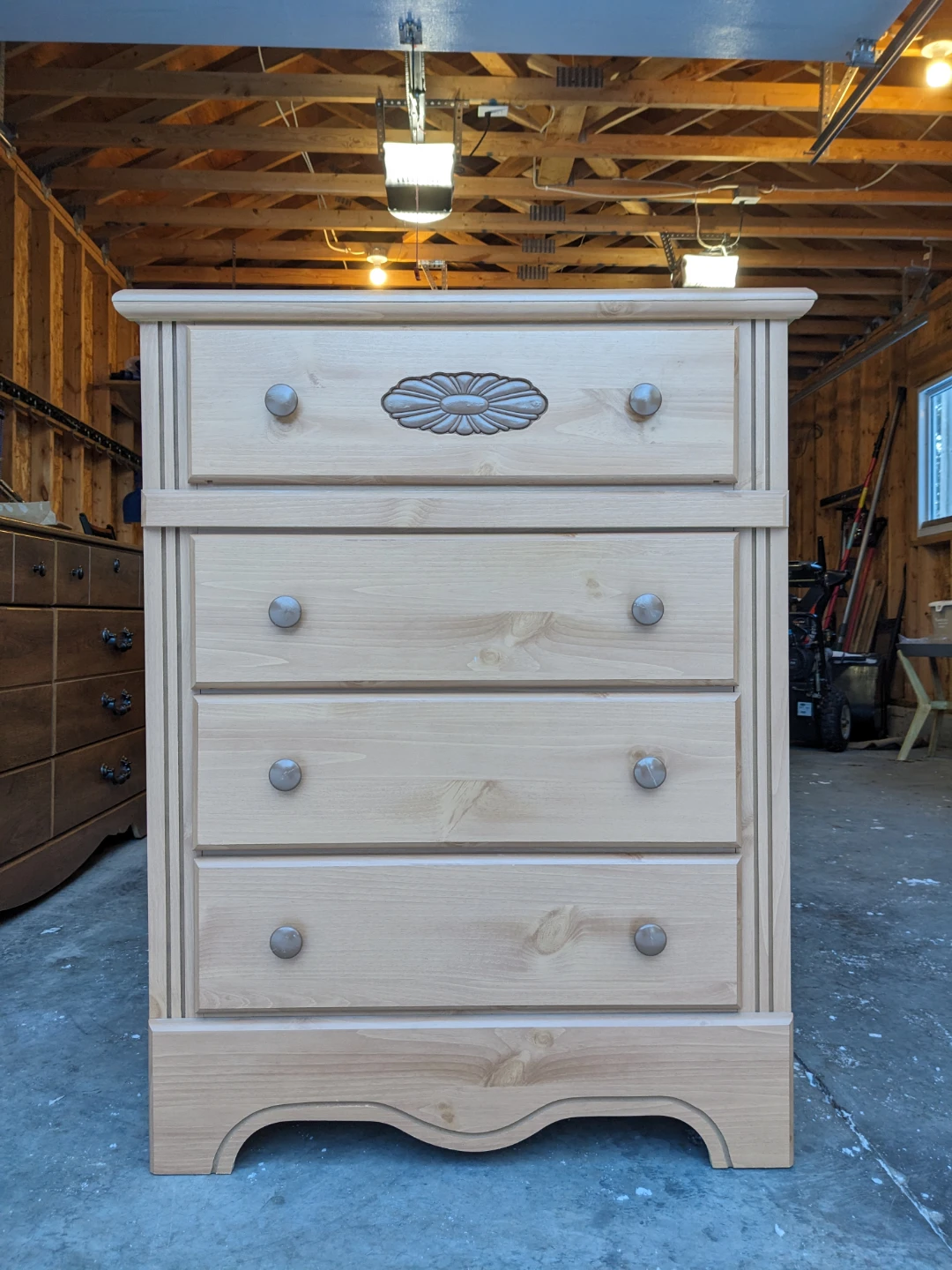 Drawers that all open and close perfectly and their modern slides with security stop system. Perfect interiors. Wood carved floral motif and scalloped edge base gives this piece a traditional charm. Curbside delivery is available with delivery payment in advance.