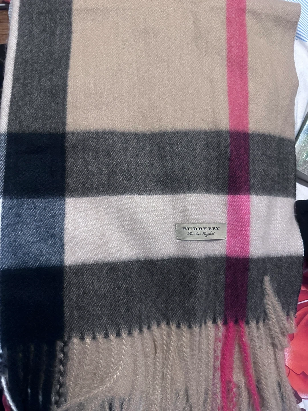 A classic Burberry plaid scarf. Made with a wool blend for warmth. Features the iconic check pattern with pink accents. Fringe detailing on the ends. Received as a gift from