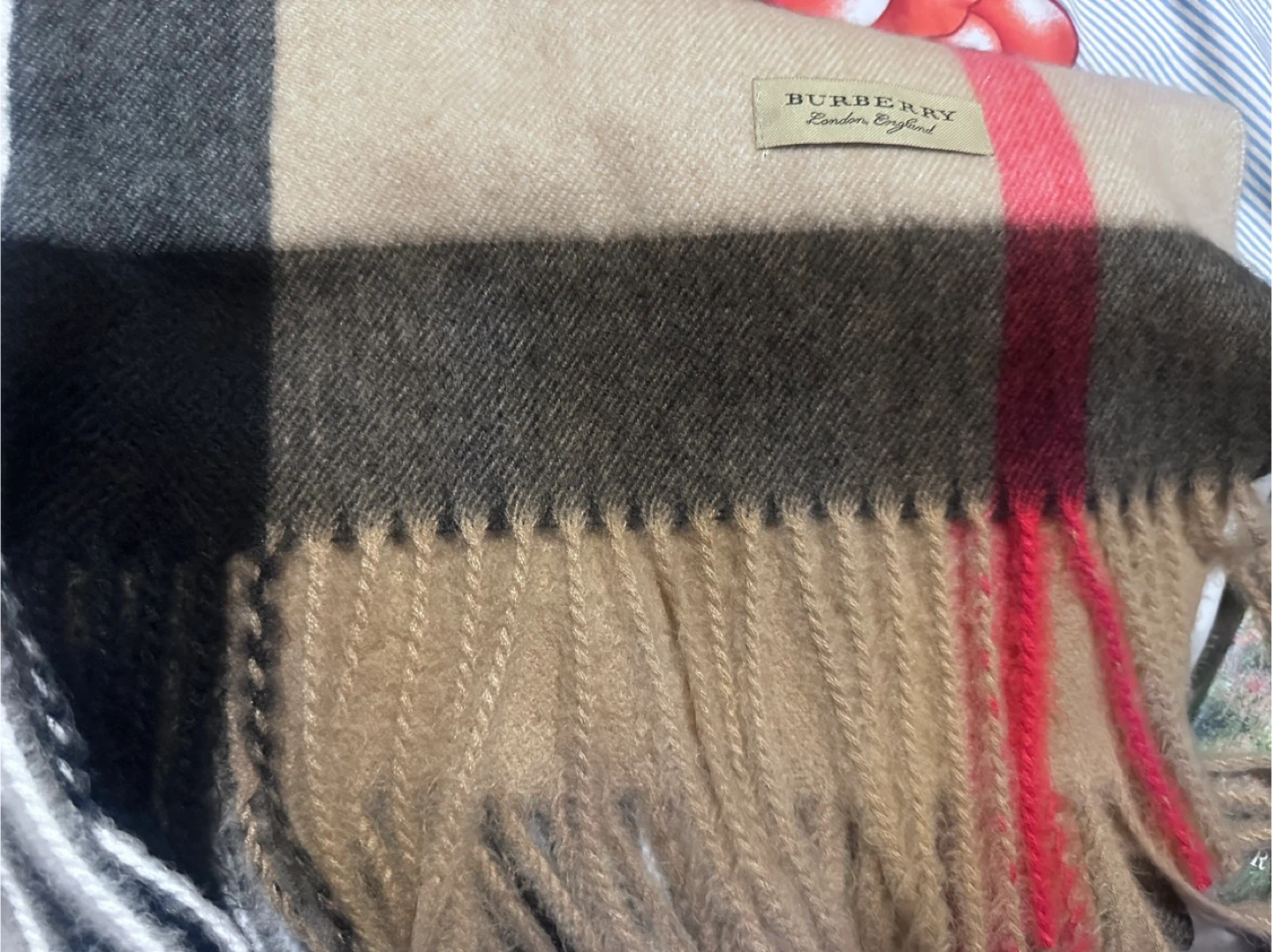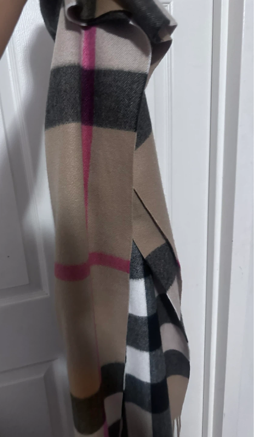 A classic Burberry plaid scarf. Made with a wool blend for warmth. Features the iconic check pattern with pink accents. Fringe detailing on the ends. Received as a gift from
