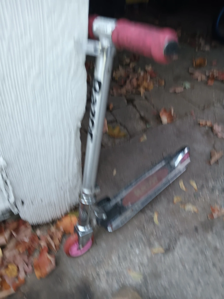 Selling a Razor scooter in silver with pink wheels and red handle grips. It shows signs of use but is still in good working condition. Perfect for kids!