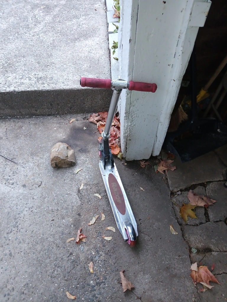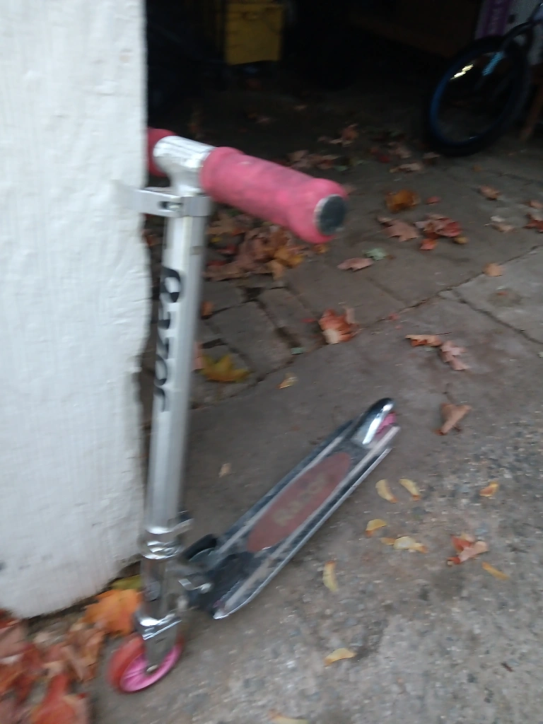 Selling a Razor scooter in silver with pink wheels and red handle grips. It shows signs of use but is still in good working condition. Perfect for kids!