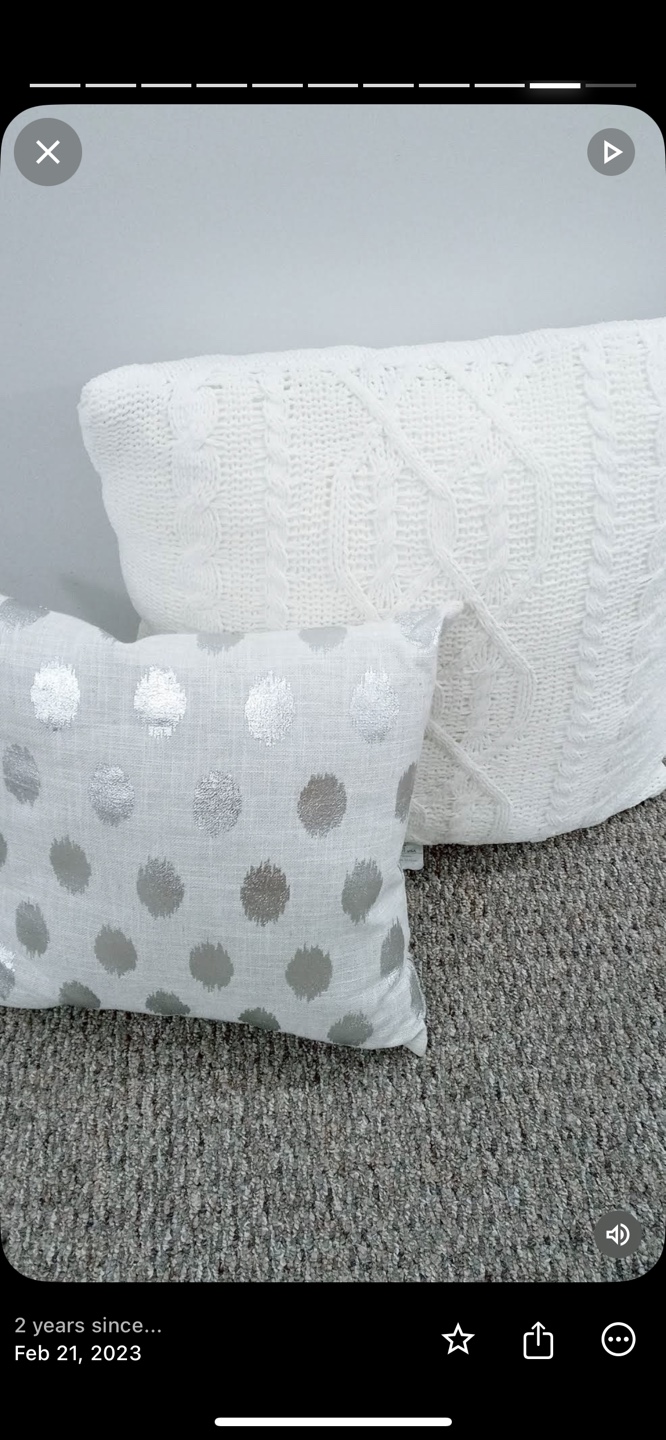 Set of two decorative throw pillows. One features a cable knit pattern, the other has silver polka dots on a white background. Perfect for adding texture and style to your living space.