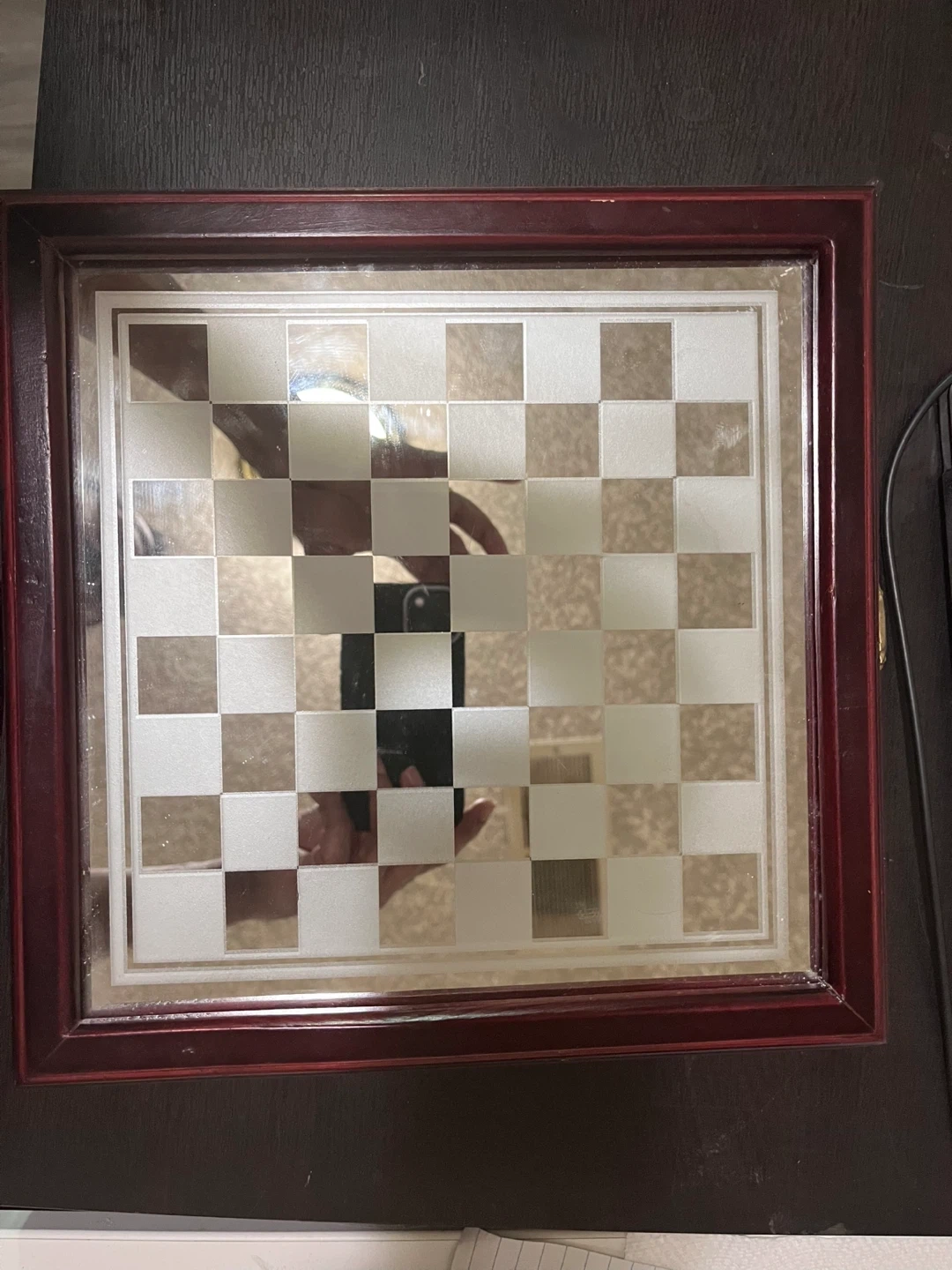 A stylish decorative glass chess board with a wooden frame. It's made of glass with a wooden border. This board is great for displaying or for casual games! Everything included.