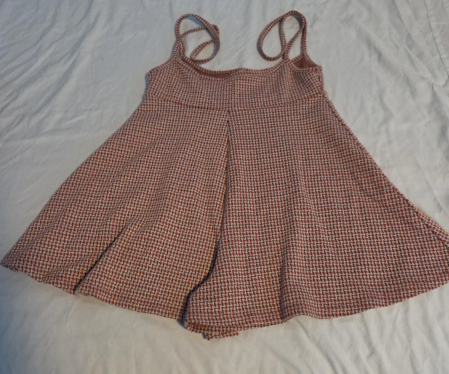 This is a cute fit and flare dress with a red, white, and black houndstooth pattern. It features thin spaghetti straps and a flattering A-line silhouette. Material is a poly-blend for easy care.