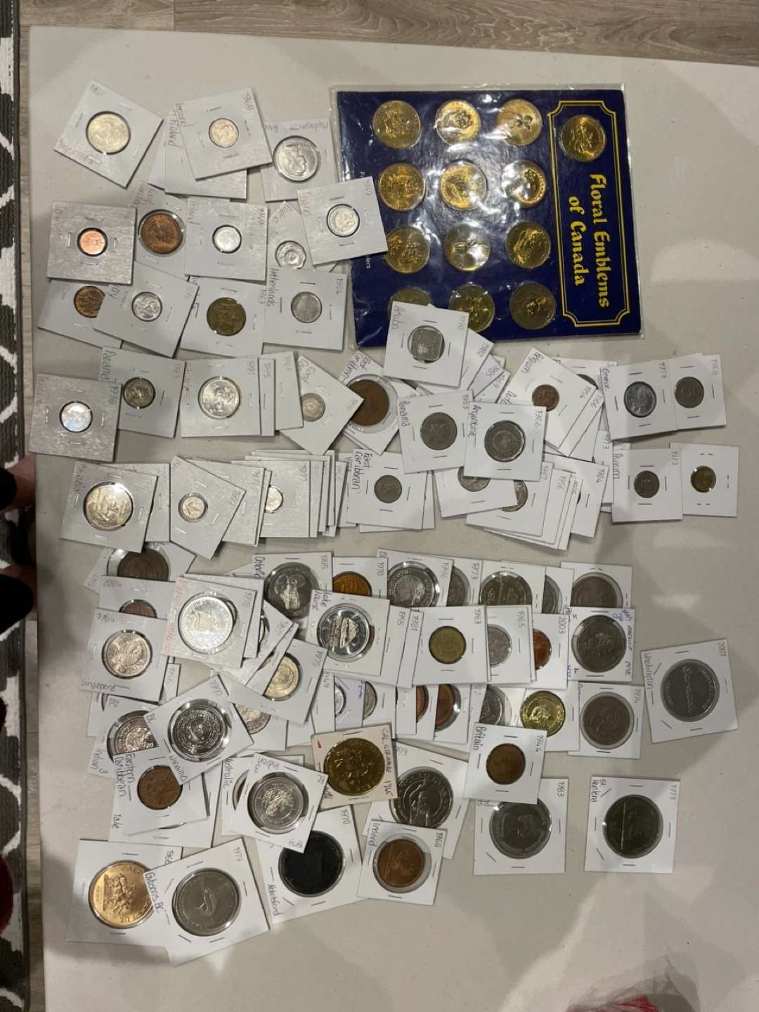 A mixed collection featuring various coins from different years and locations, alongside various Star Trek/Marvel/ Xmen trading cards sets. It’s a great find for collectors interested in numismatics and pop culture memorabilia.