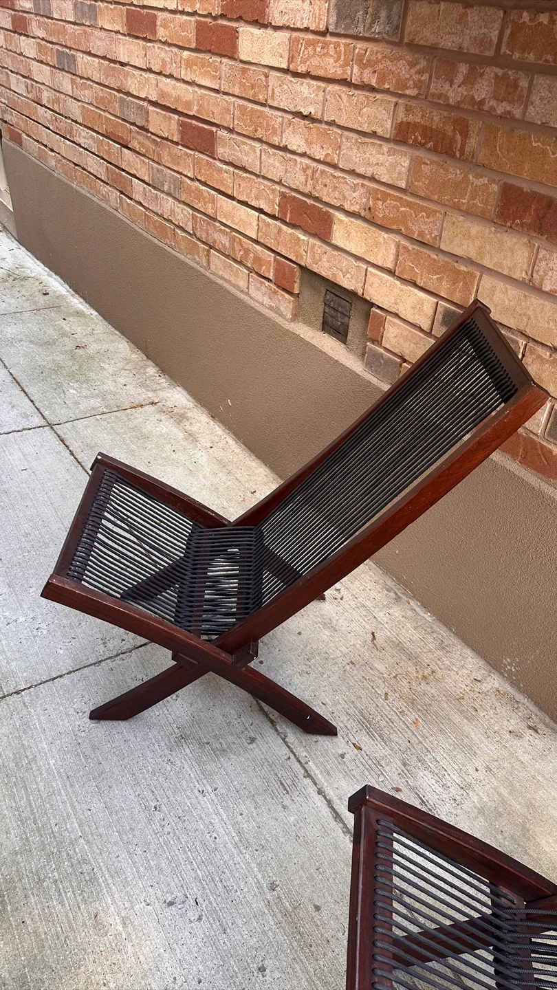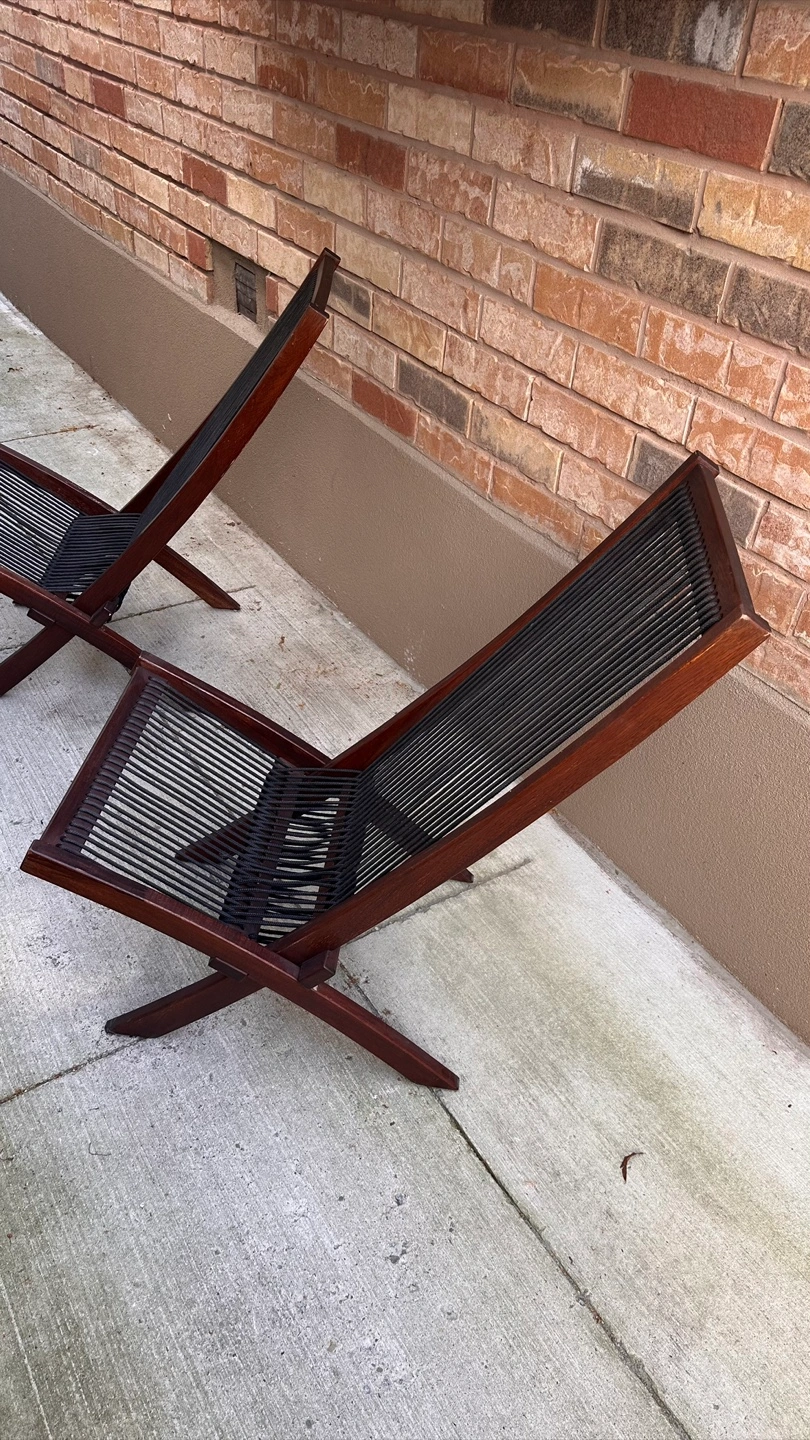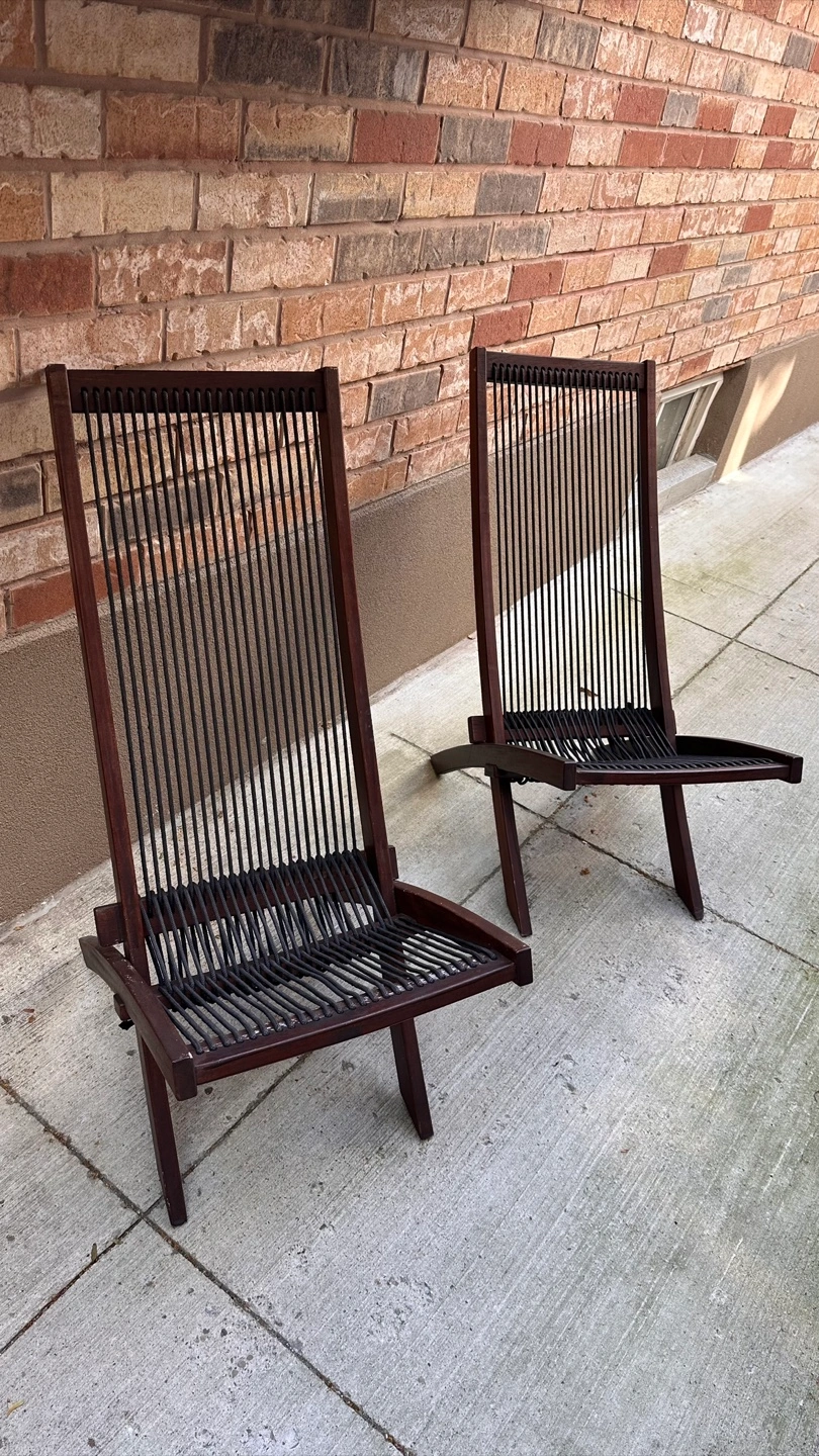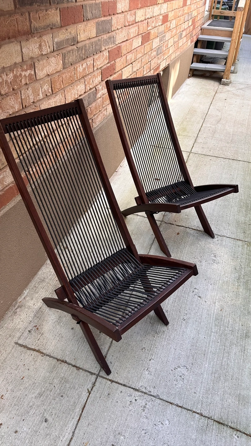 Selling a set of two folding sling chairs. They feature a dark brown wood frame and black rope seating. These chairs are perfect for relaxing outdoors or indoors, and they fold easily for storage
