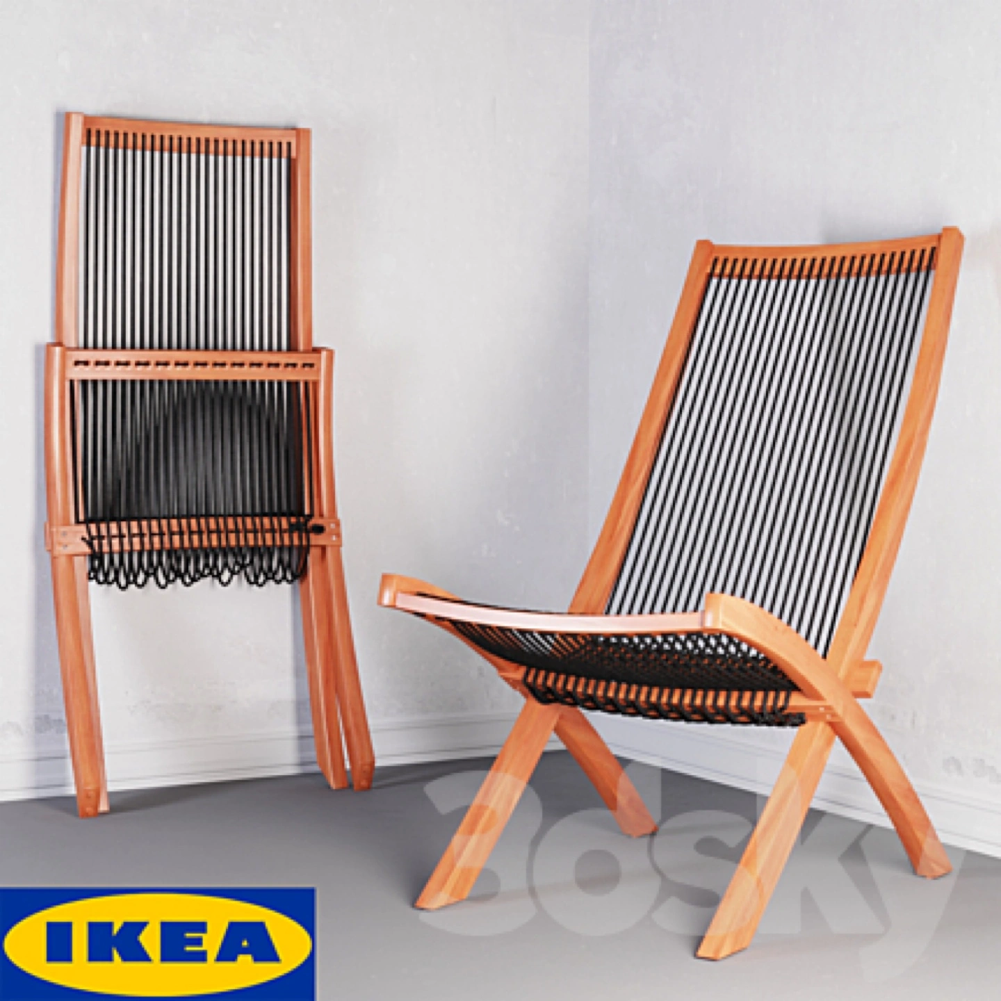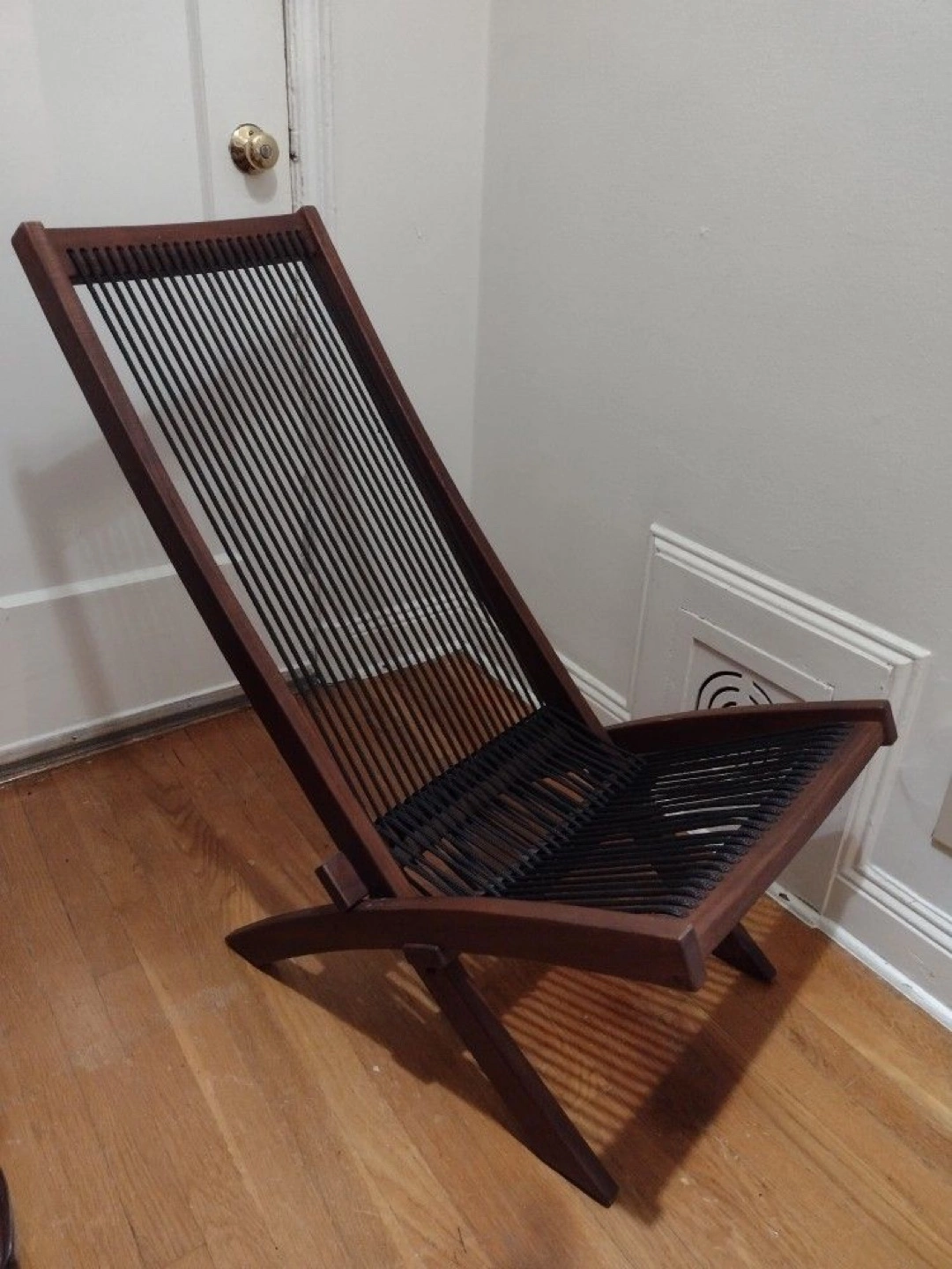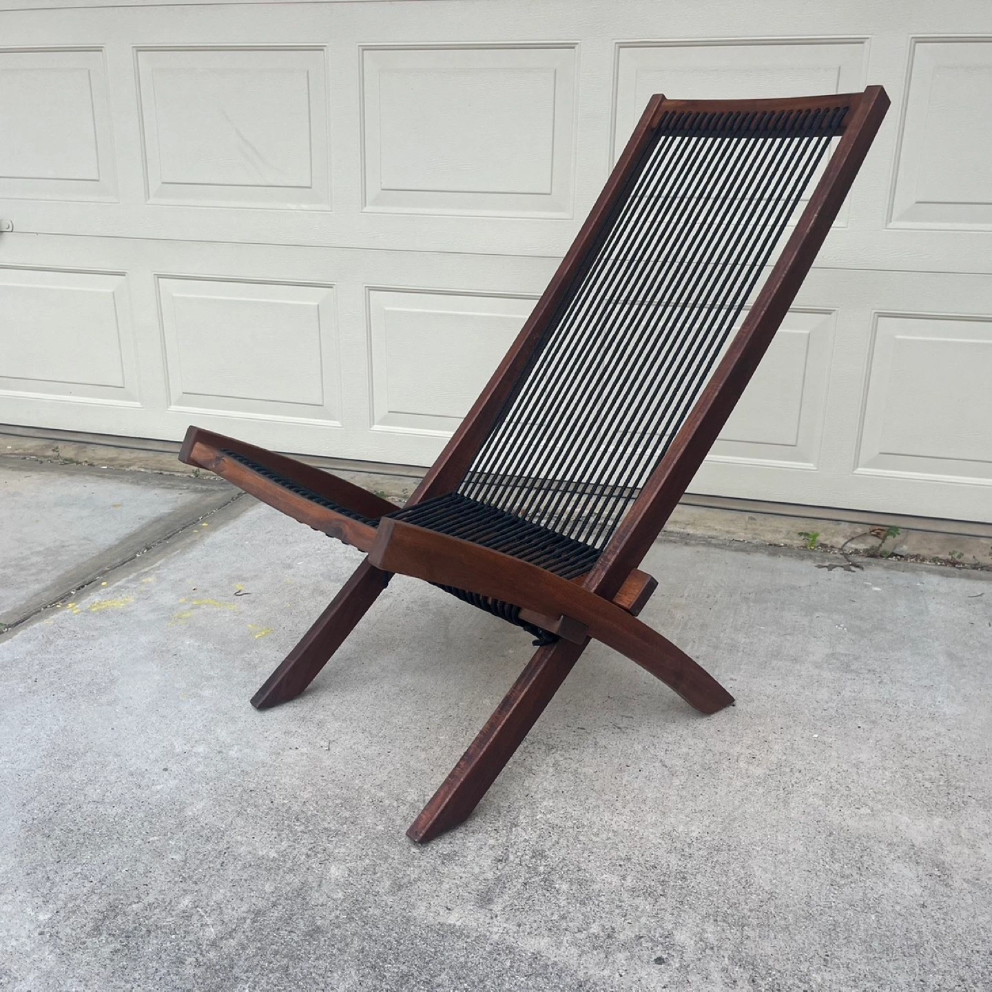 Selling a set of two folding sling chairs. They feature a dark brown wood frame and black rope seating. These chairs are perfect for relaxing outdoors or indoors, and they fold easily for storage