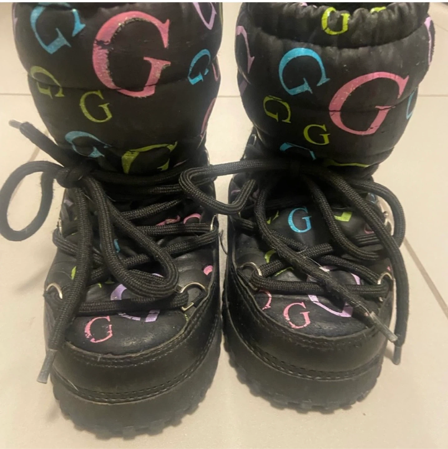 Cute pair of Guess toddlers winter boots! They are black with the Guess logo printed all over. Perfect for keeping your baby girls feet warm and stylish during the colder months.