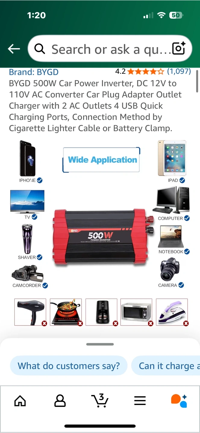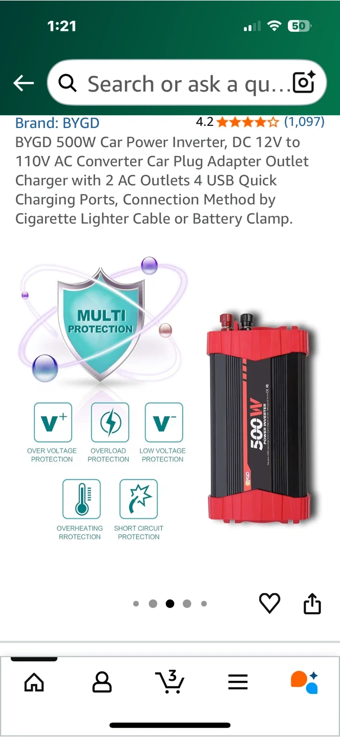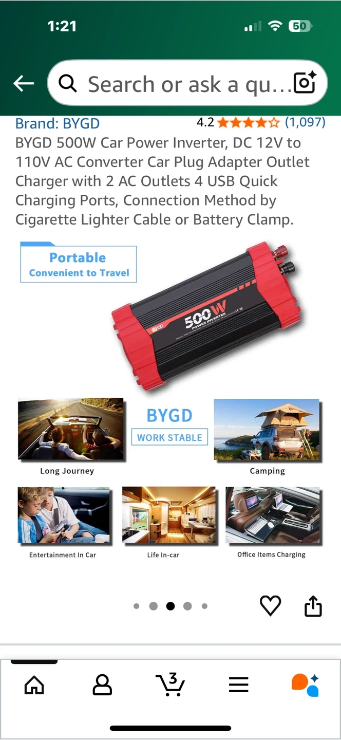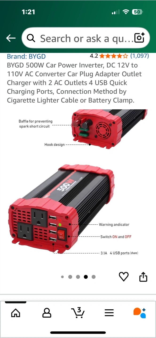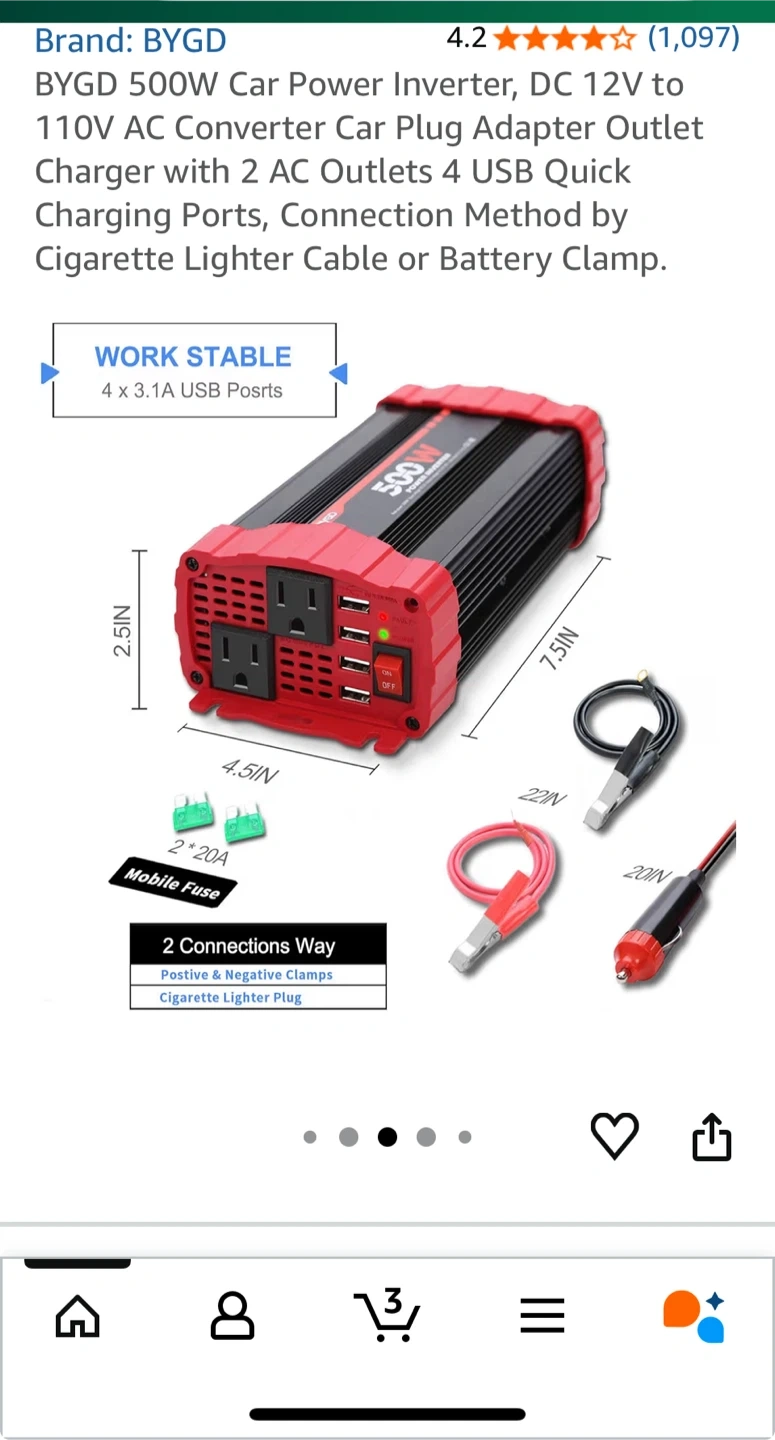 Looking to sell a BYGD 500W Car Power Inverter. It converts DC 12V to 110V AC and comes with a car plug adapter outlet charger. It also has 2 AC outlets and 4 USB quick charging ports. It can be connected via cigarette lighter cable or battery clamp. Great for long journeys and camping!