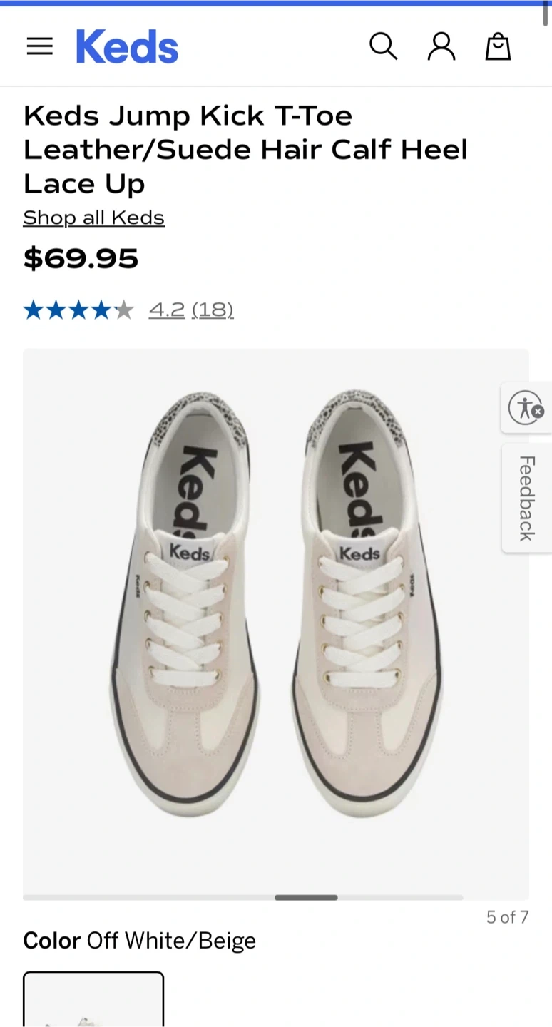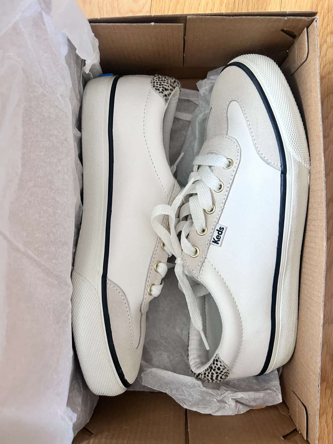 Keds Jump Kick T-Toe sneakers in off-white and beige. These lace-up shoes feature suede accents and a faux calf hair heel detail. They're made with leather and suede for a stylish look. Comes with the original box.