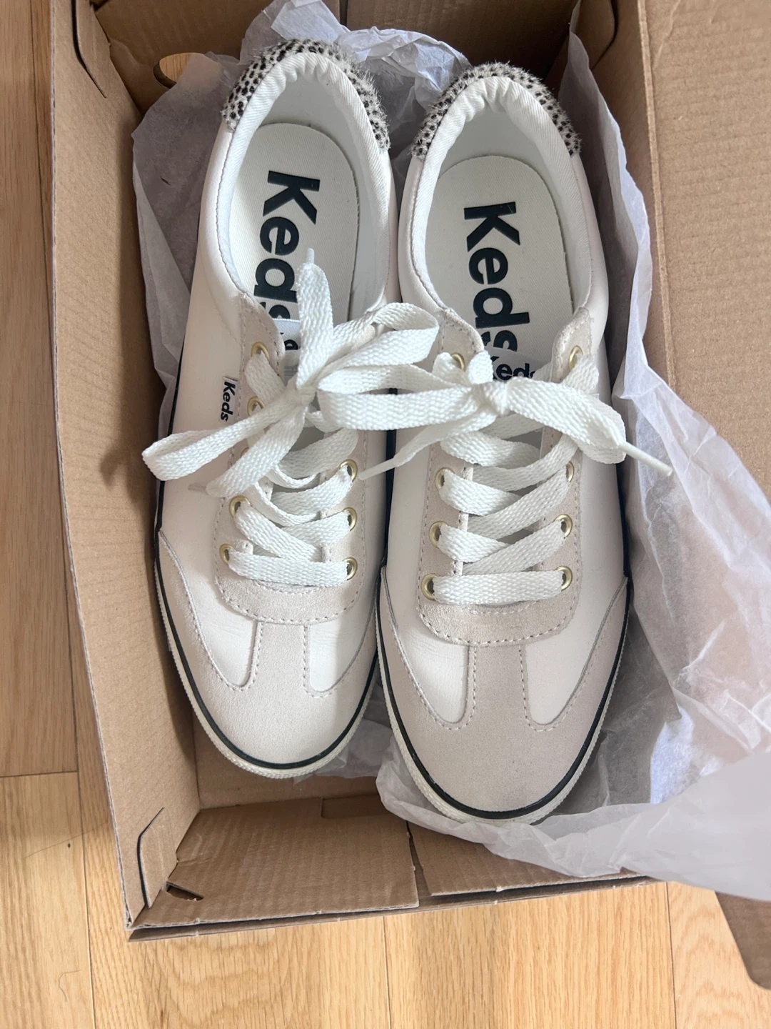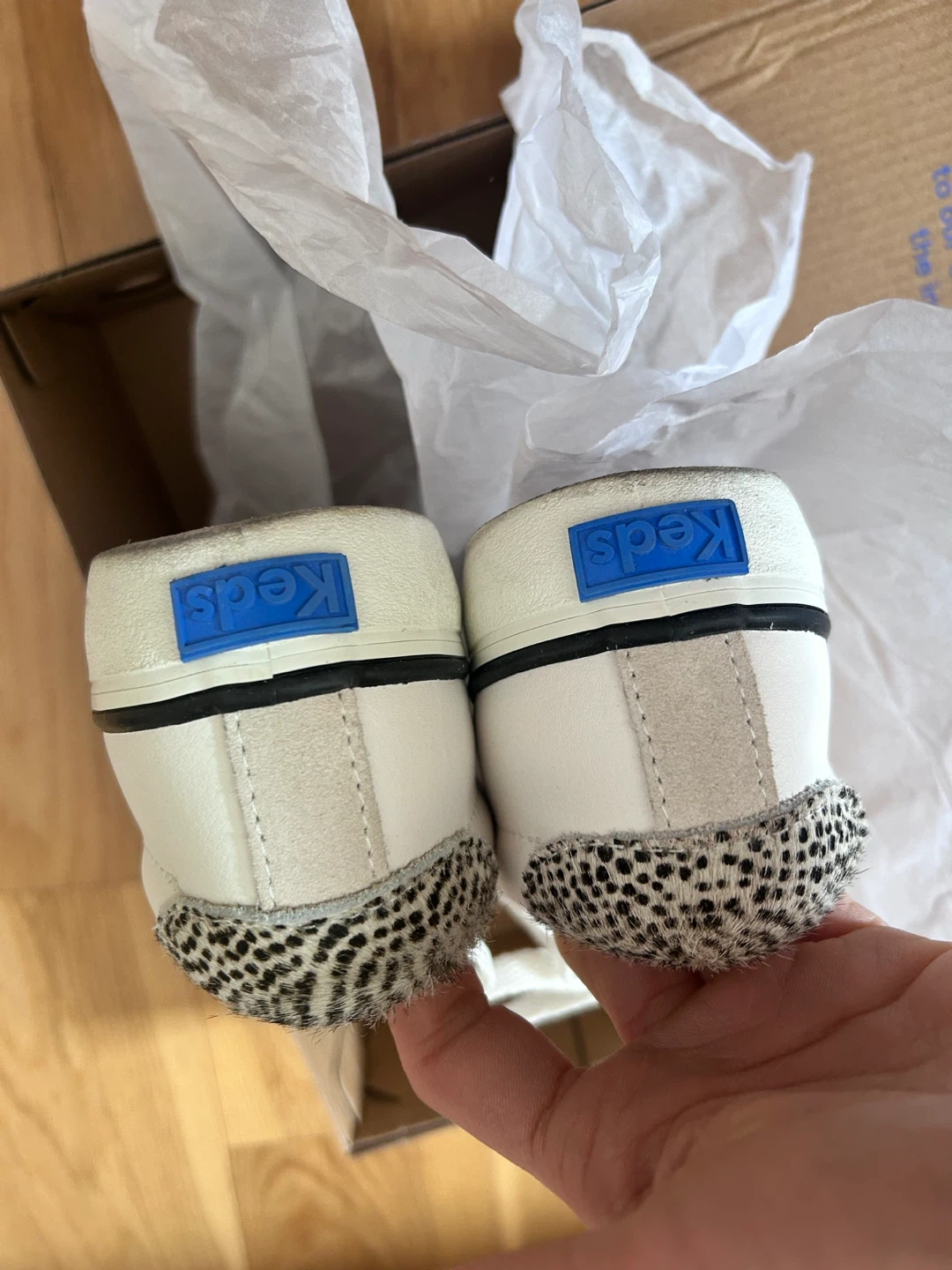 Keds Jump Kick T-Toe sneakers in off-white and beige. These lace-up shoes feature suede accents and a faux calf hair heel detail. They're made with leather and suede for a stylish look. Comes with the original box.