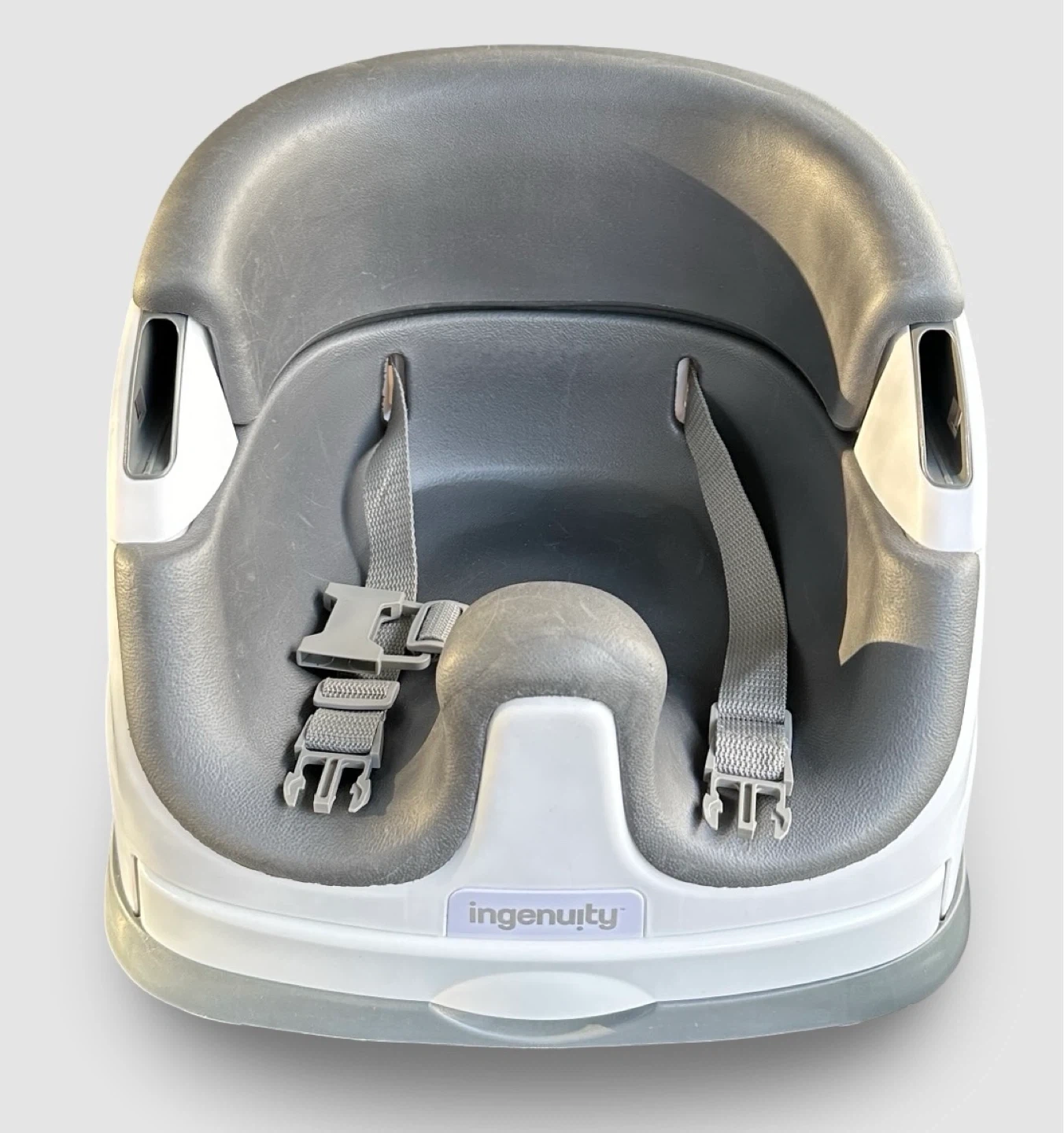 This Ingenuity booster seat is designed for mealtime convenience. It features a grey, wipeable seat with a white plastic base. The adjustable harness keeps your little one secure. It's great for feeding babies and toddlers at the table.