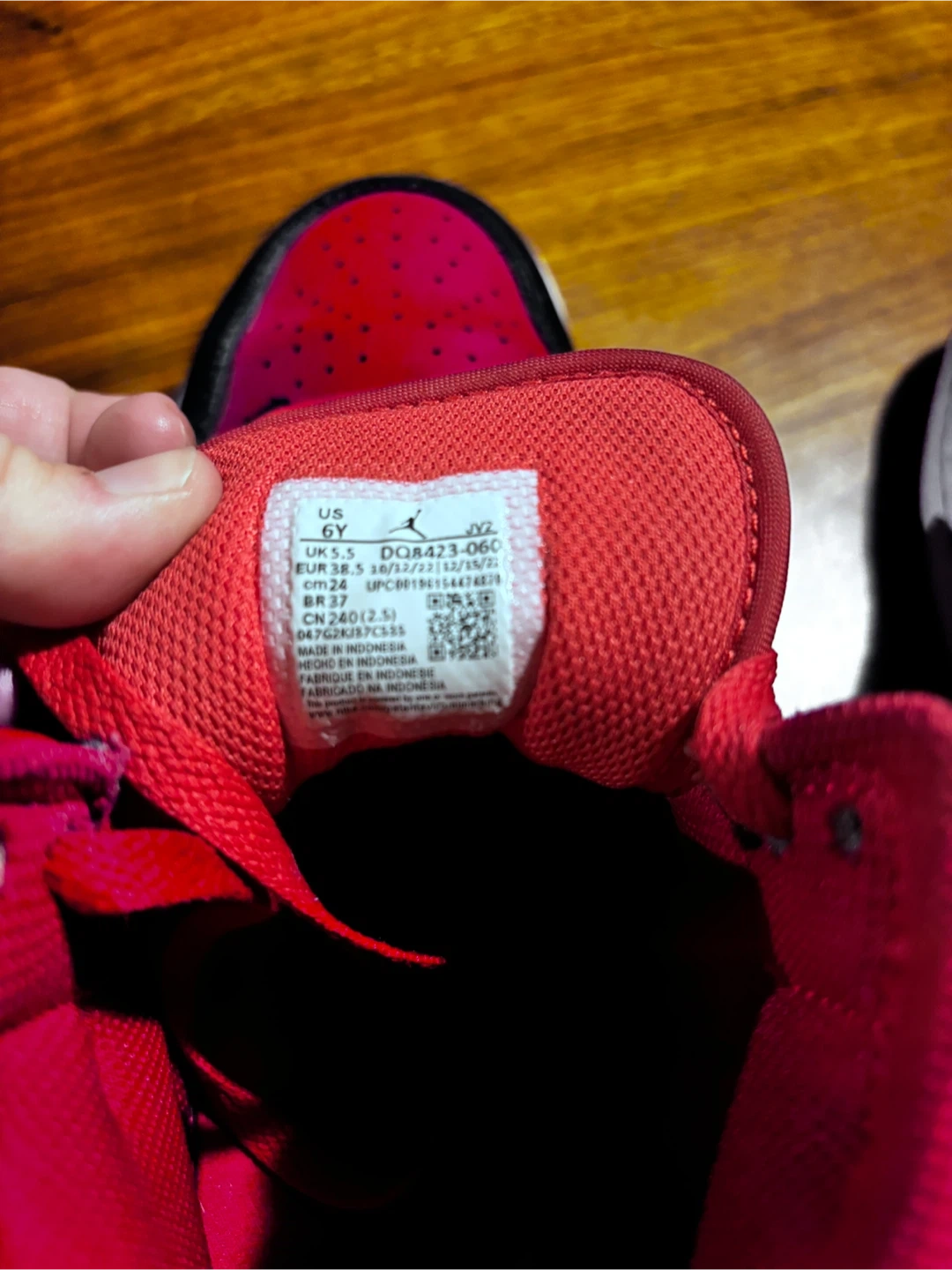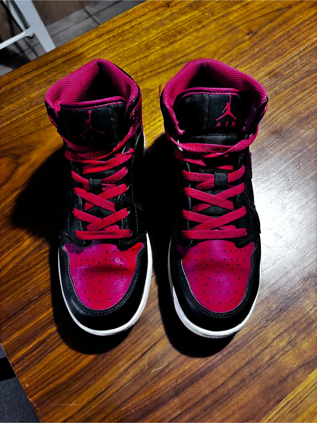 These are youth Air Jordan 1 Mid SE sneakers in a black and red colourway. They're a US kids' size 6Y. Pick up in North Oshawa