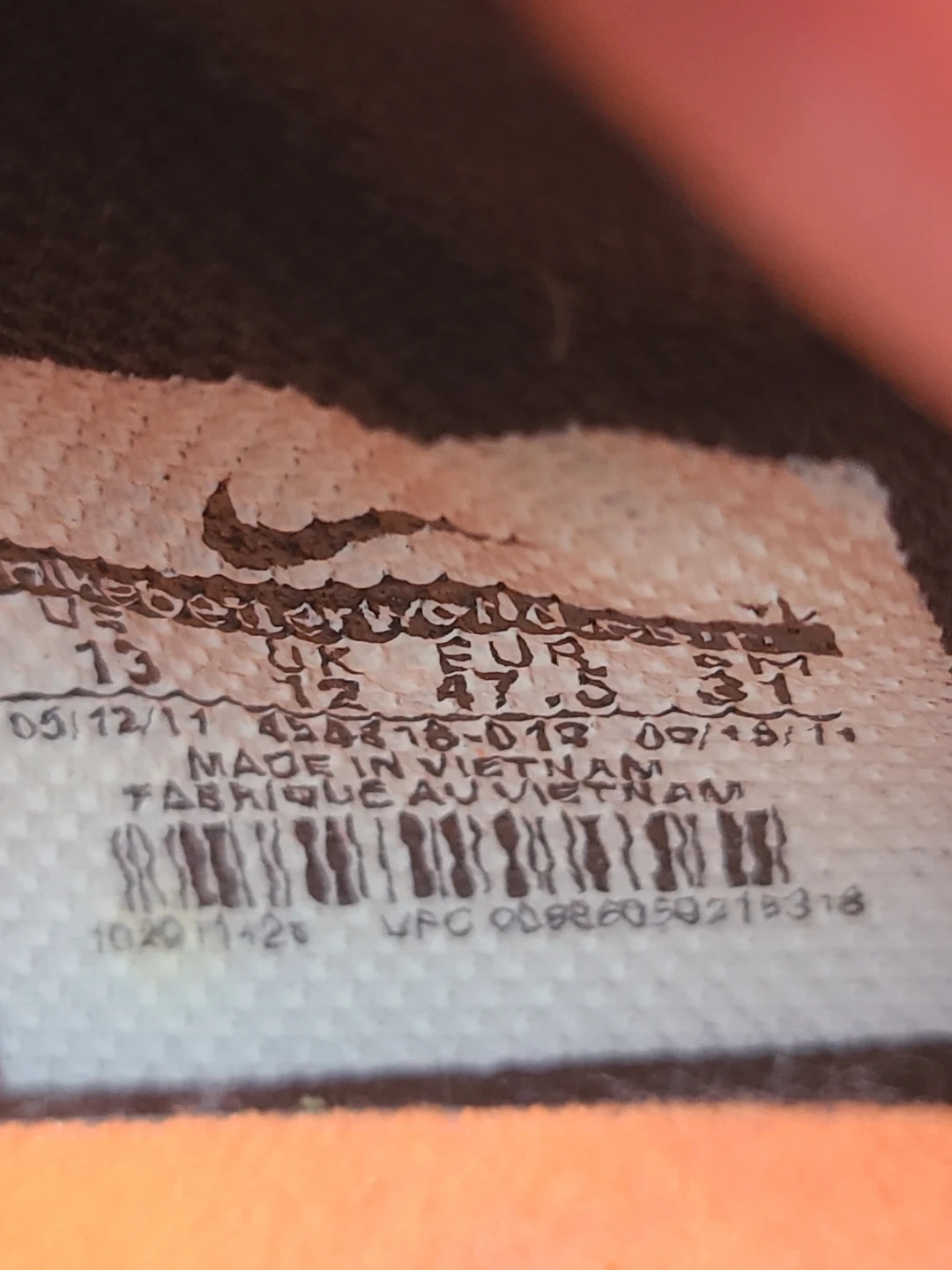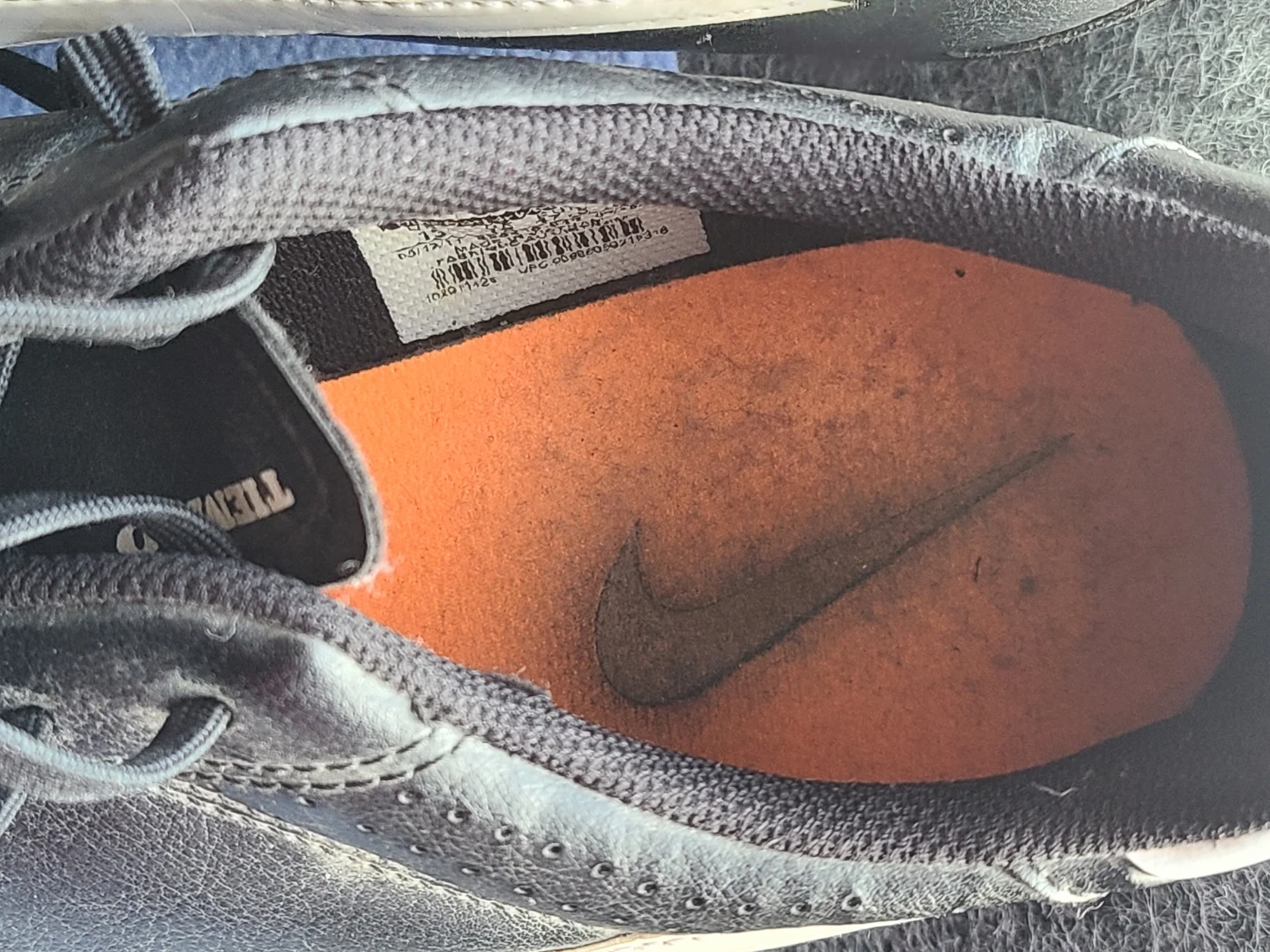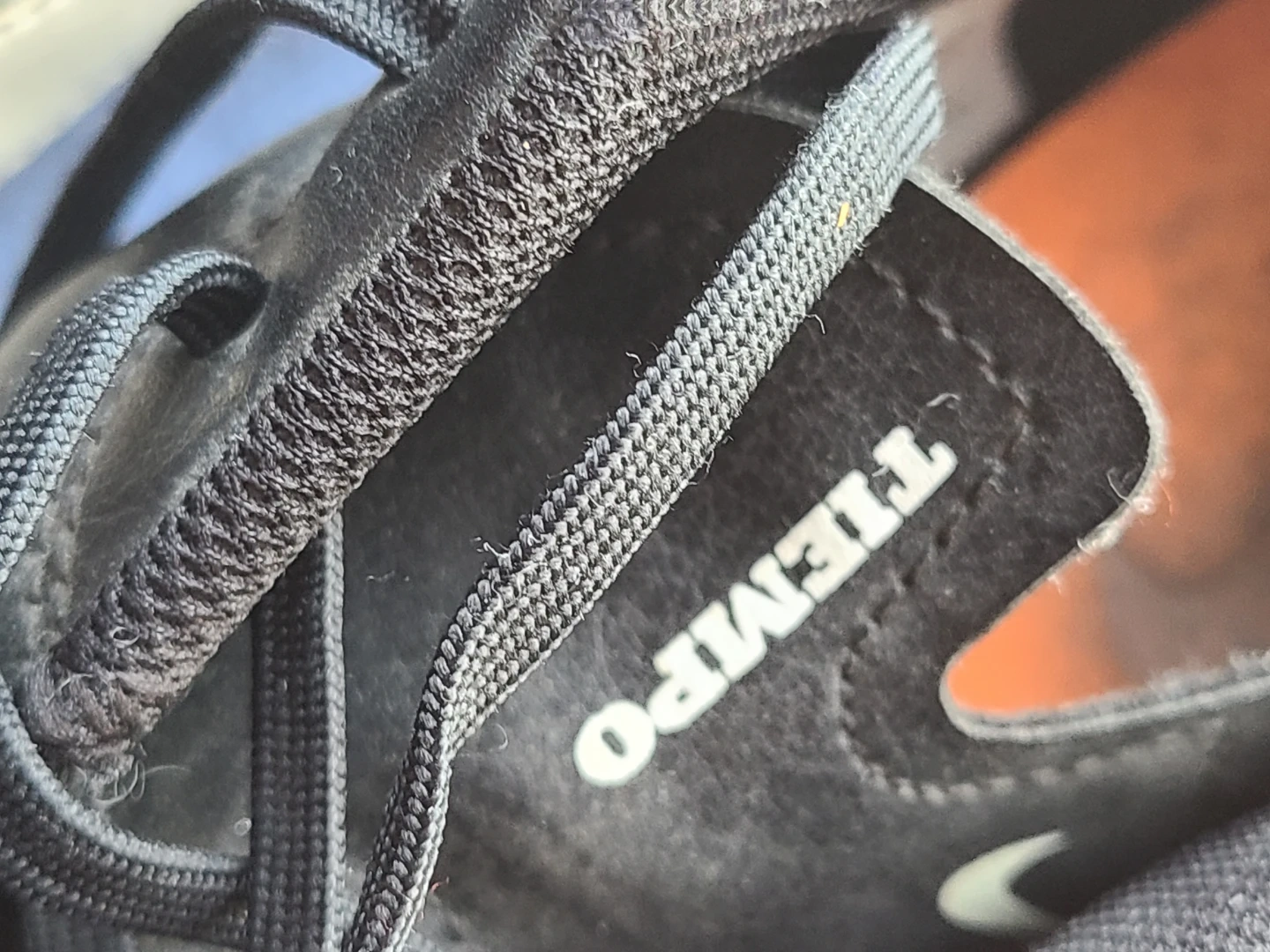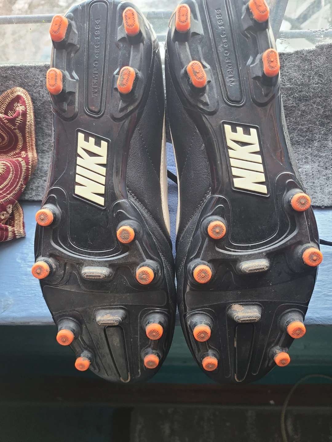 Nike Tiempo soccer cleats in black and white. These cleats are made in Vietnam and feature orange studs for traction. Size is 13 US