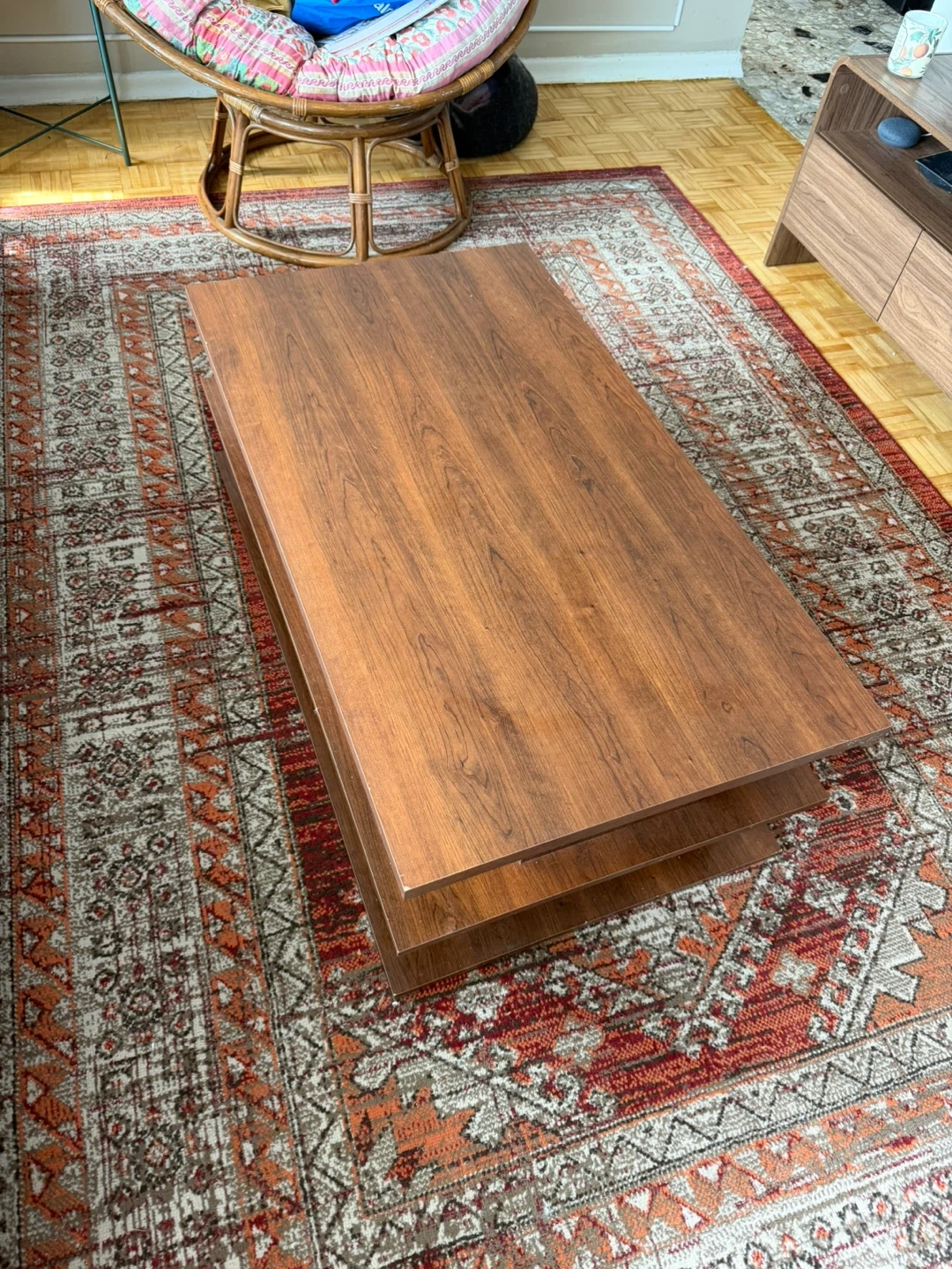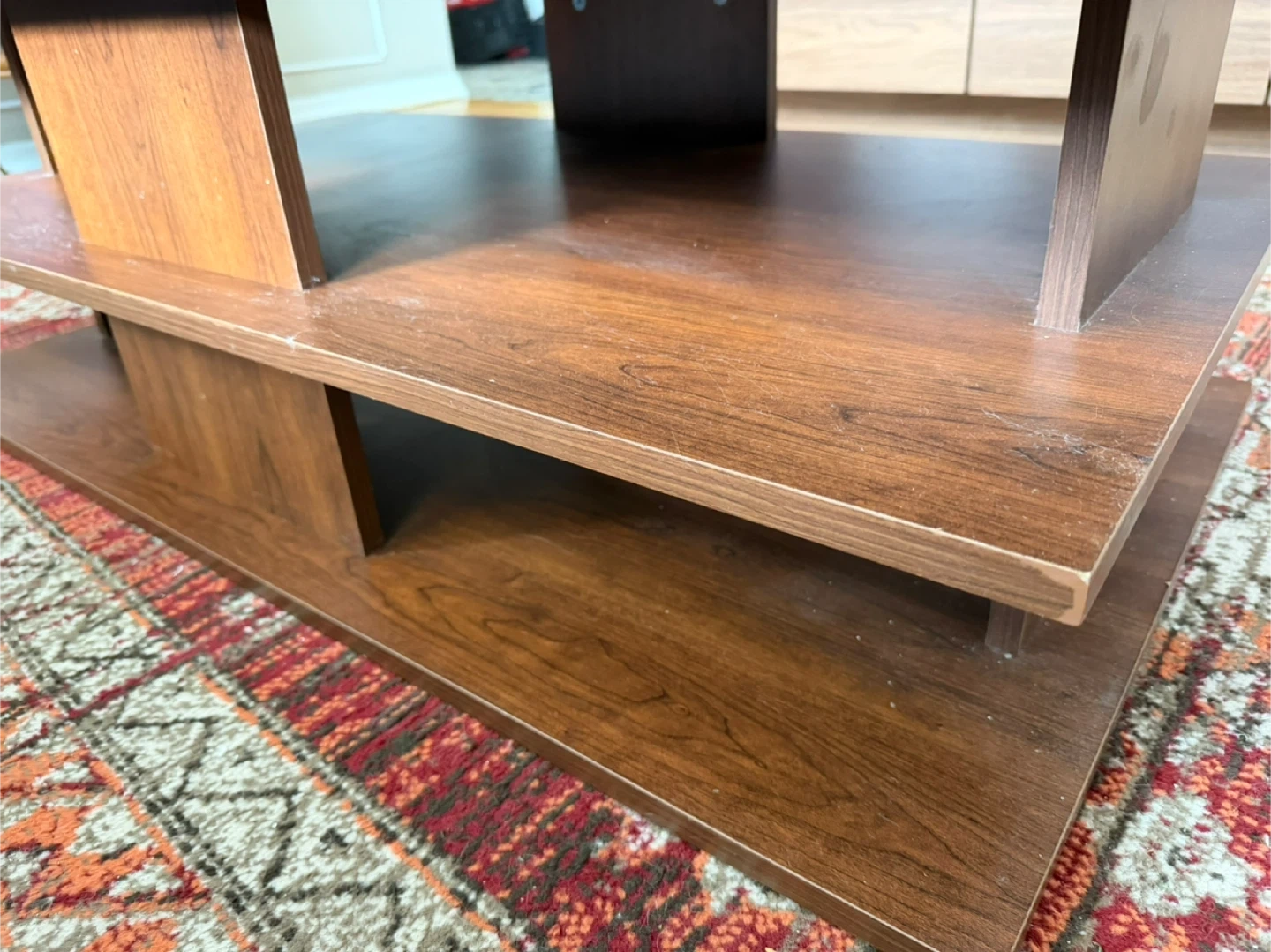 This is a two-tiered wooden coffee table. It's made of a wood-look laminate. The lower shelf provides extra storage space.