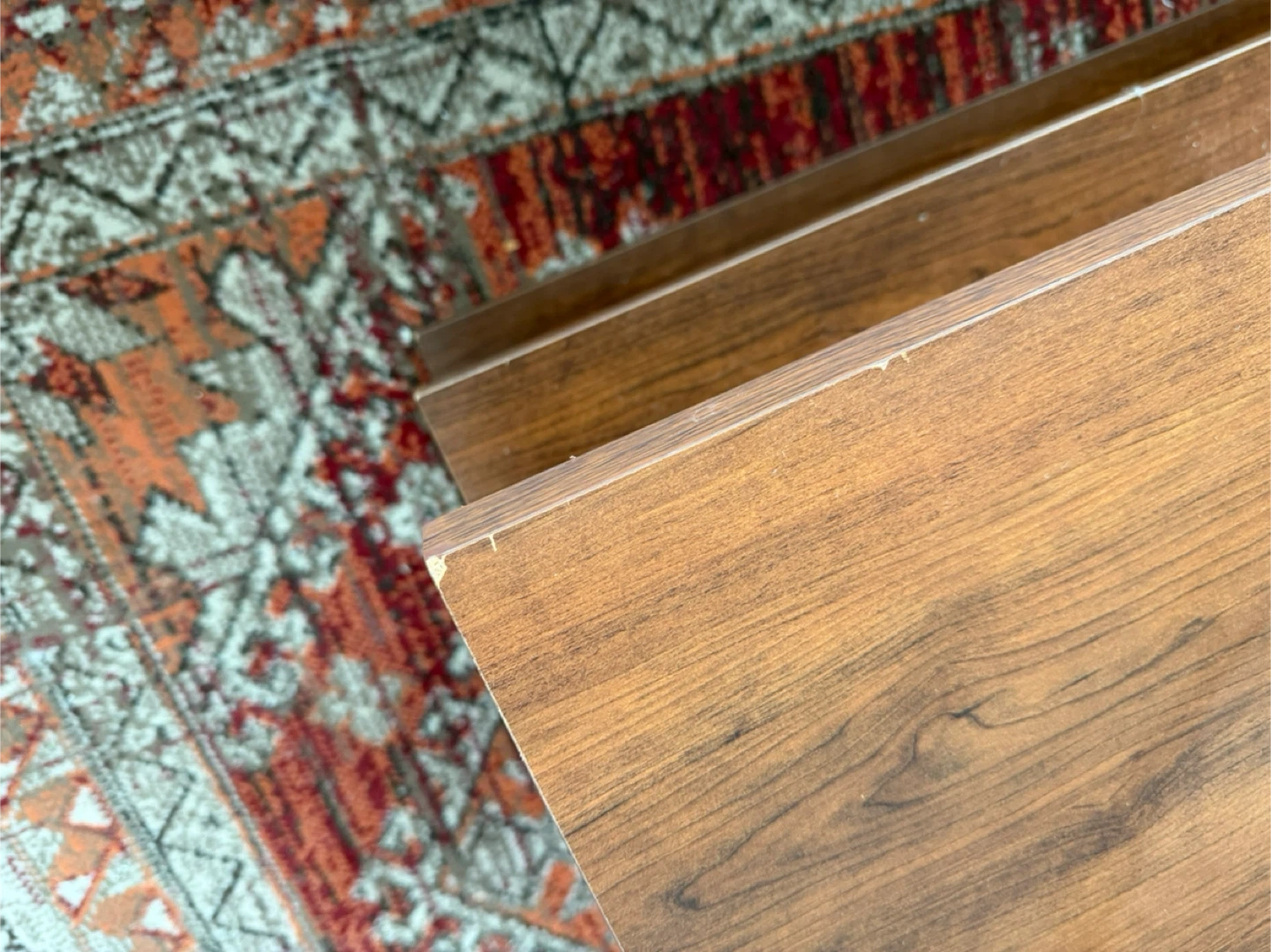This is a two-tiered wooden coffee table. It's made of a wood-look laminate. The lower shelf provides extra storage space.